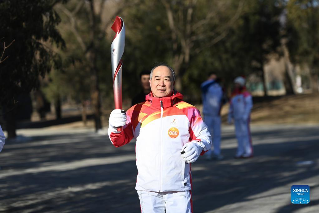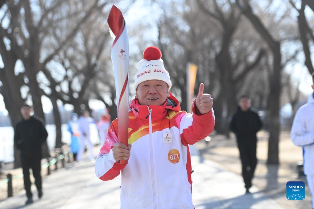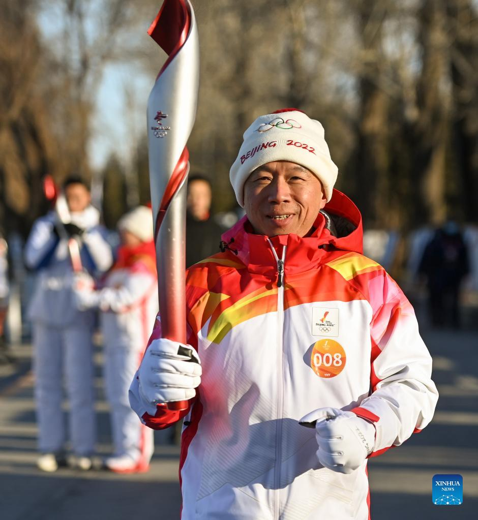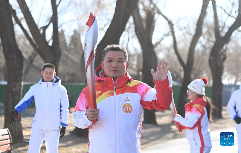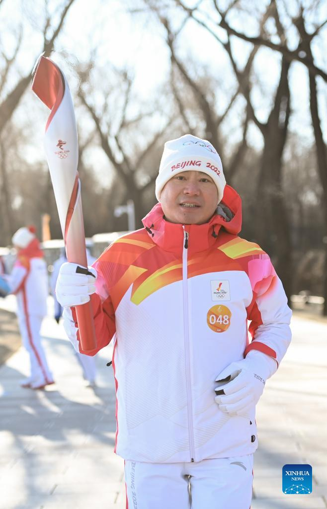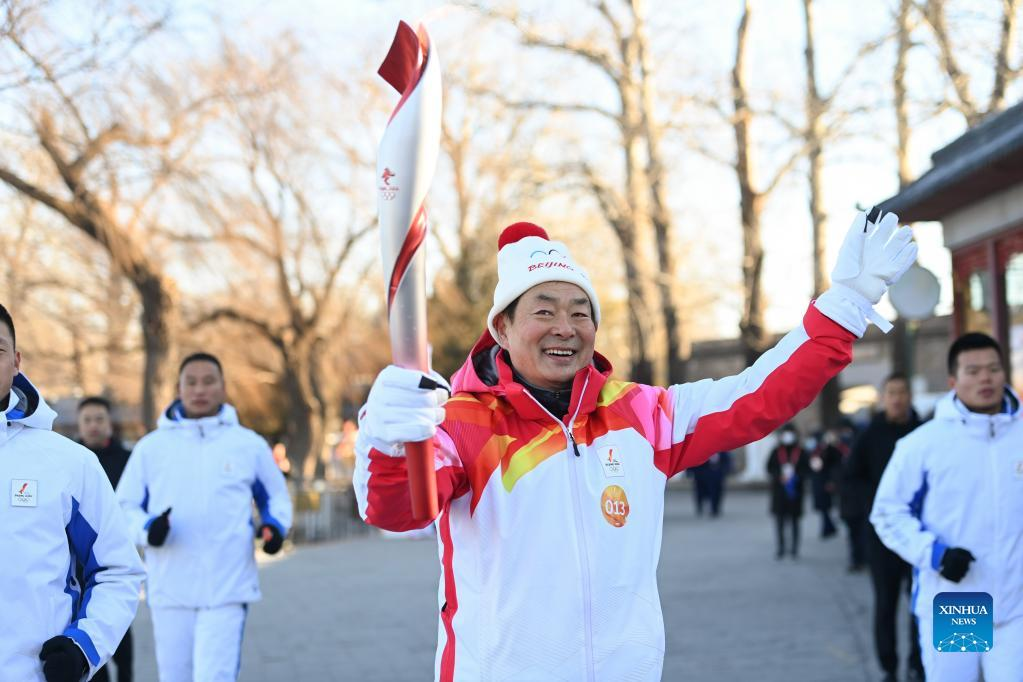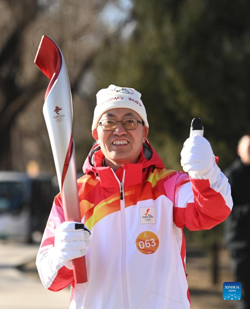 Torch bearer Liu Kejing (R front) and Liu Xiaochang attend the Beijing 2022 Olympic Torch Relay at Summer Palace in Beijing, capital of China, Feb. 4, 2022. (Xinhua/Chen Yehua)