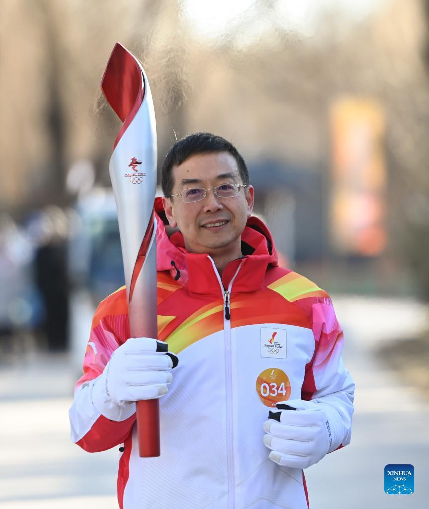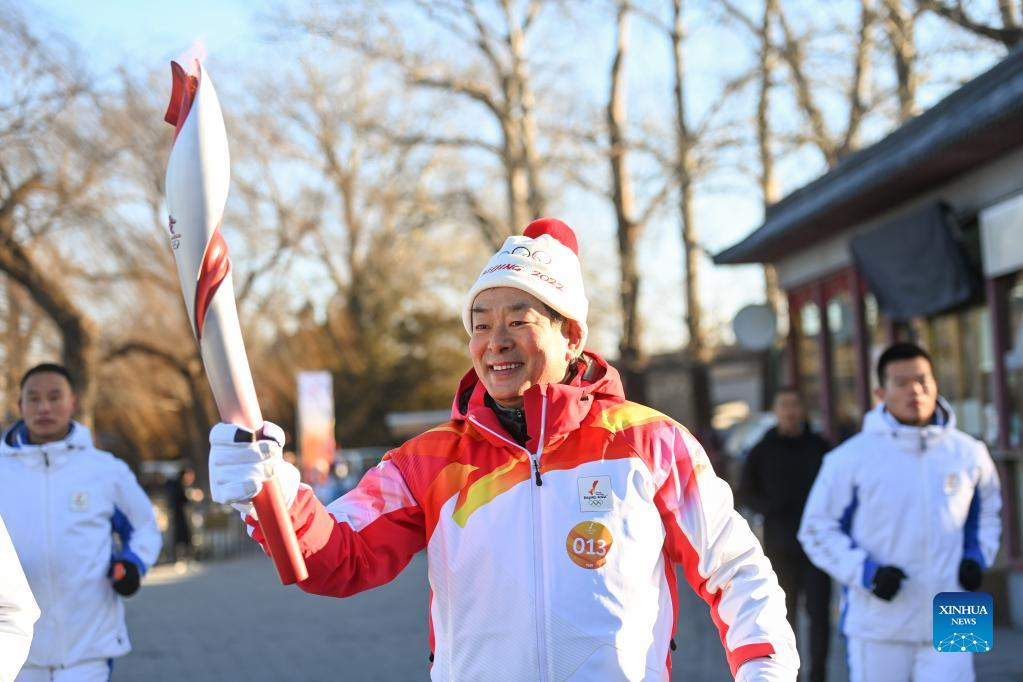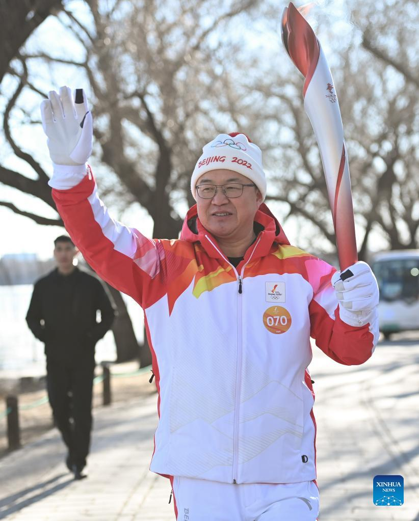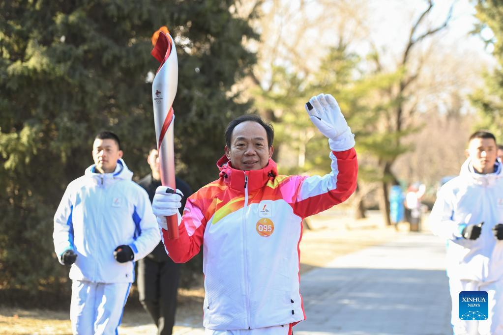 Torch bearer Zhou Guangtao runs with the torch during the Beijing 2022 Olympic Torch Relay at the Summer Palace in Beijing, capital of China, Feb. 4, 2022. (Xinhua/Chen Yehua)