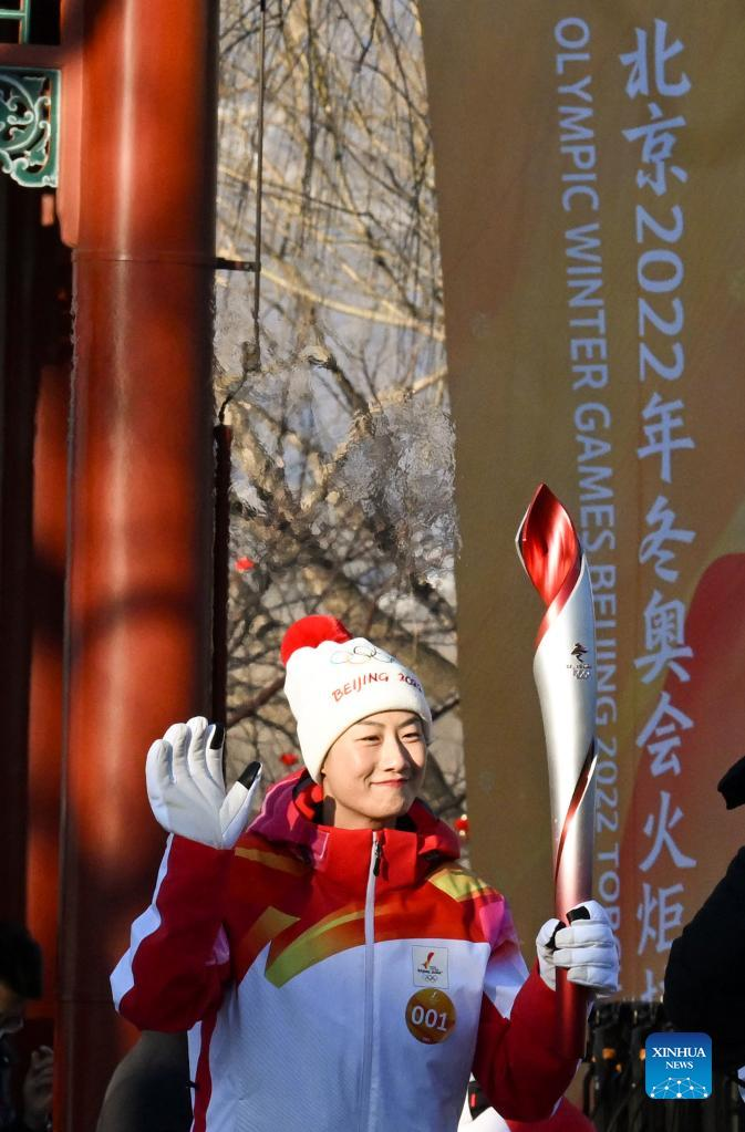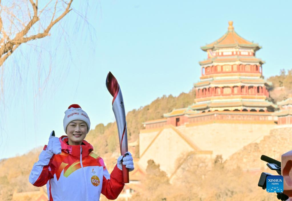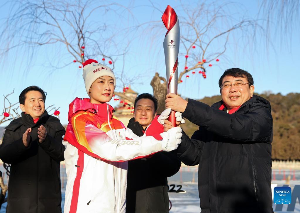 Torch bearer Ding Ning (2nd L) attends the Beijing Olympic Torch Relay at the Summer Palace in Beijing, capital of China, Feb. 4, 2022. (Xinhua/Jia Haocheng)