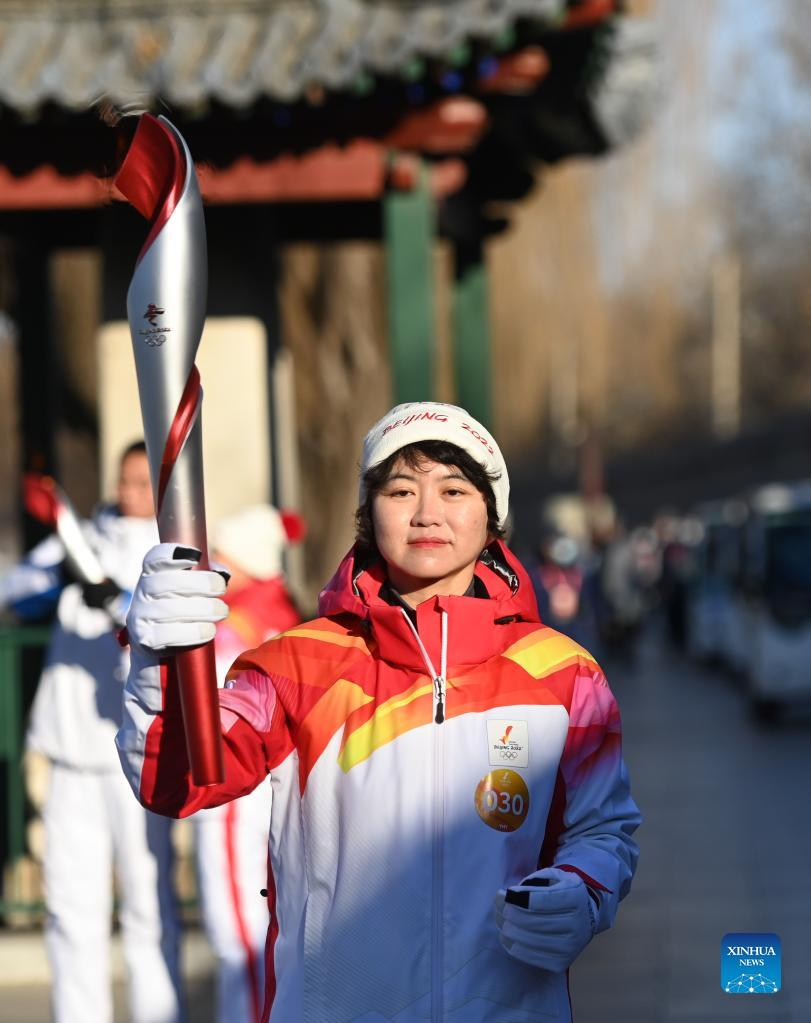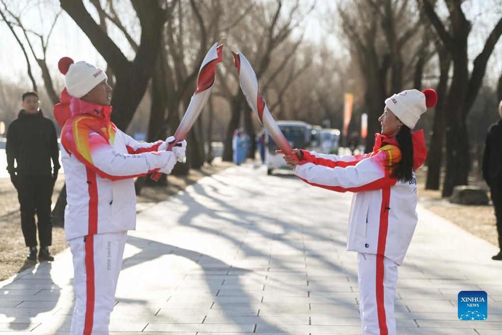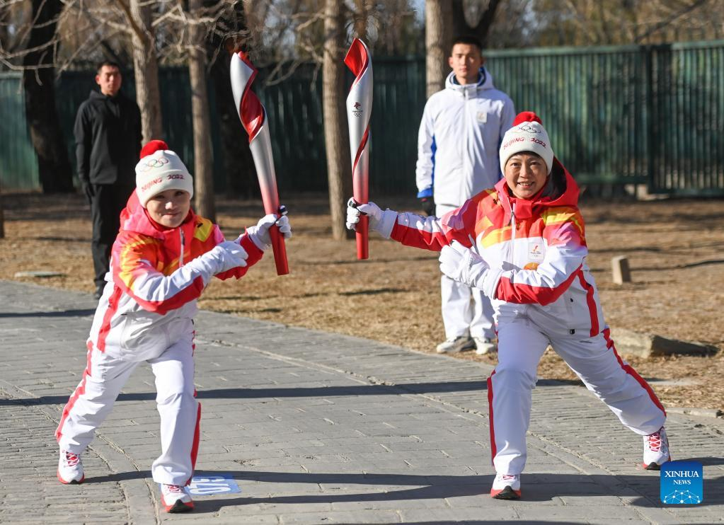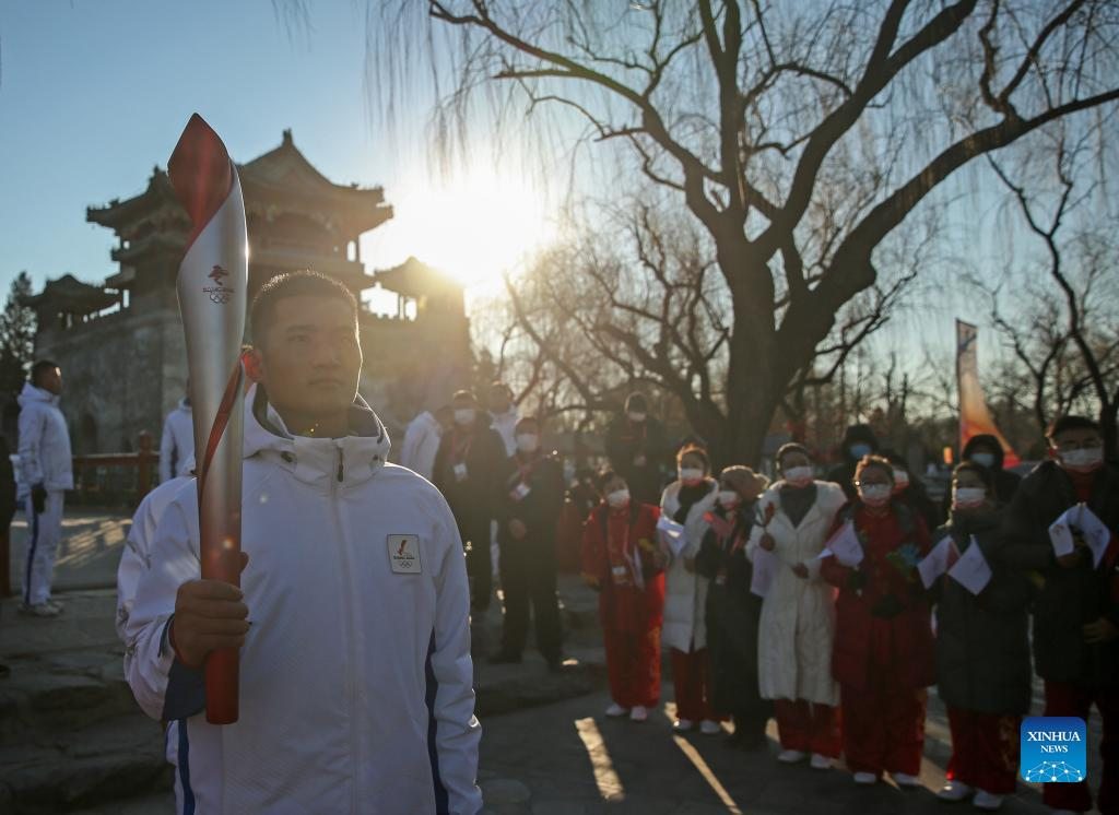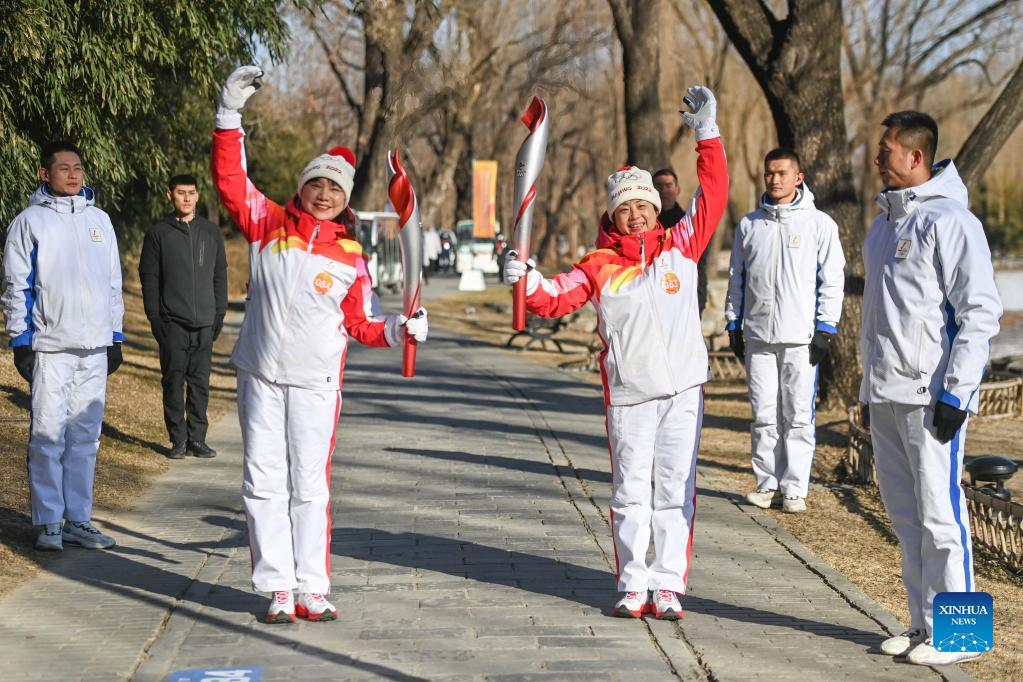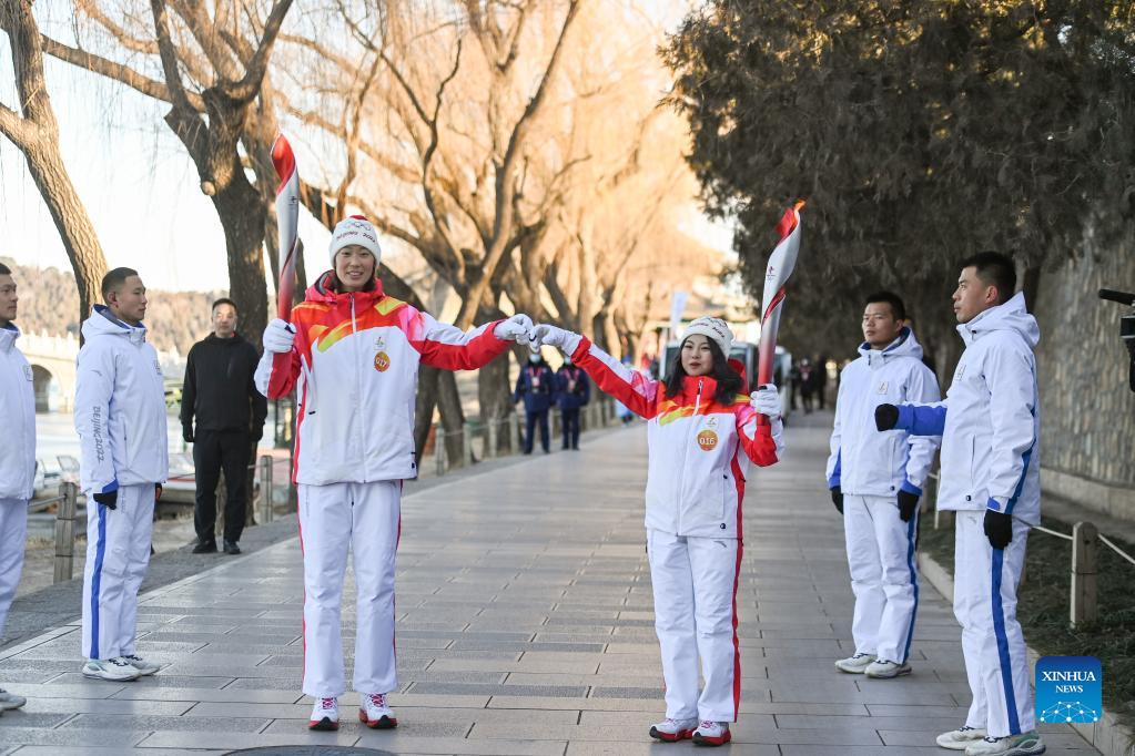 Torch bearer Liu Kejing (L front) and Liu Chang attend the Beijing 2022 Olympic Torch Relay at Summer Palace in Beijing, capital of China, Feb. 4, 2022. (Xinhua/Chen Yehua)