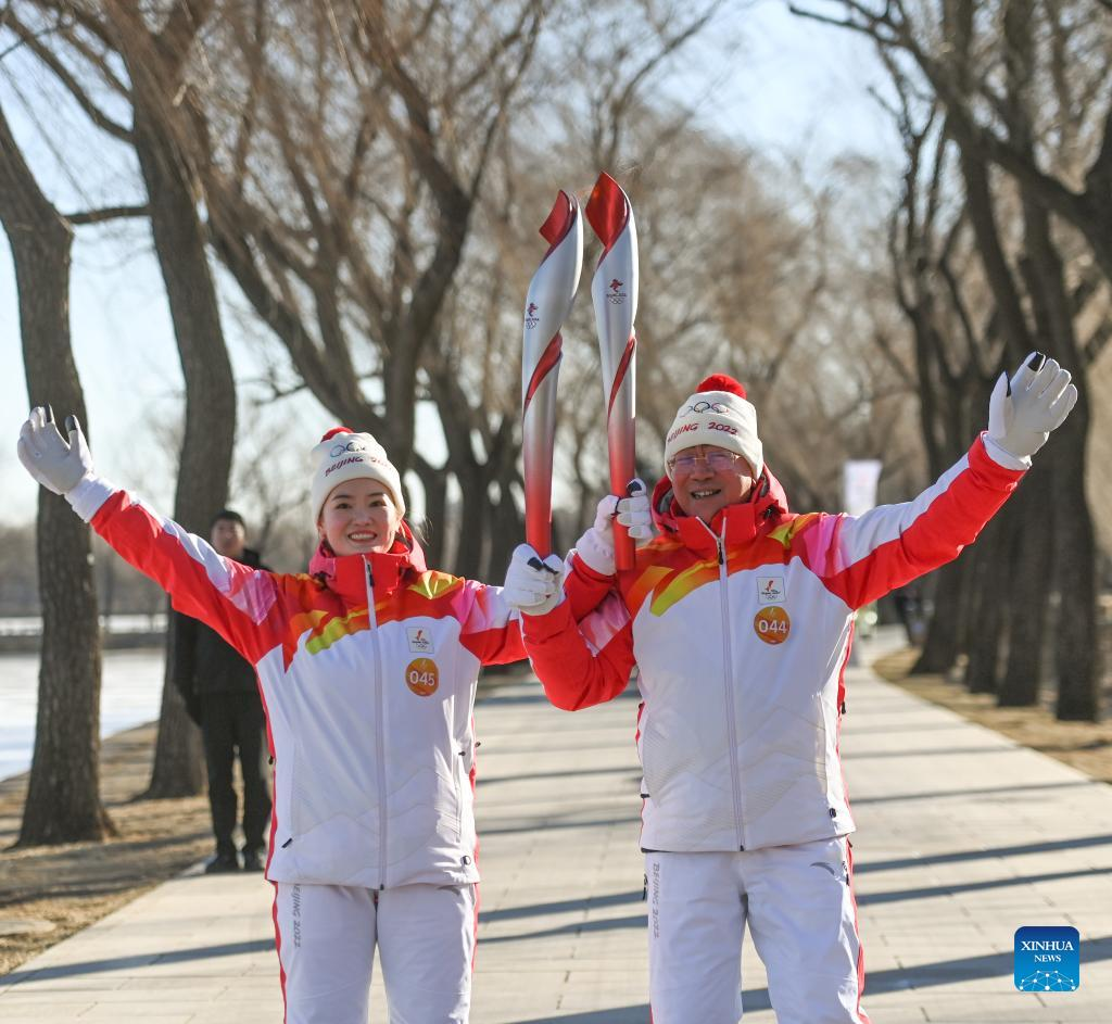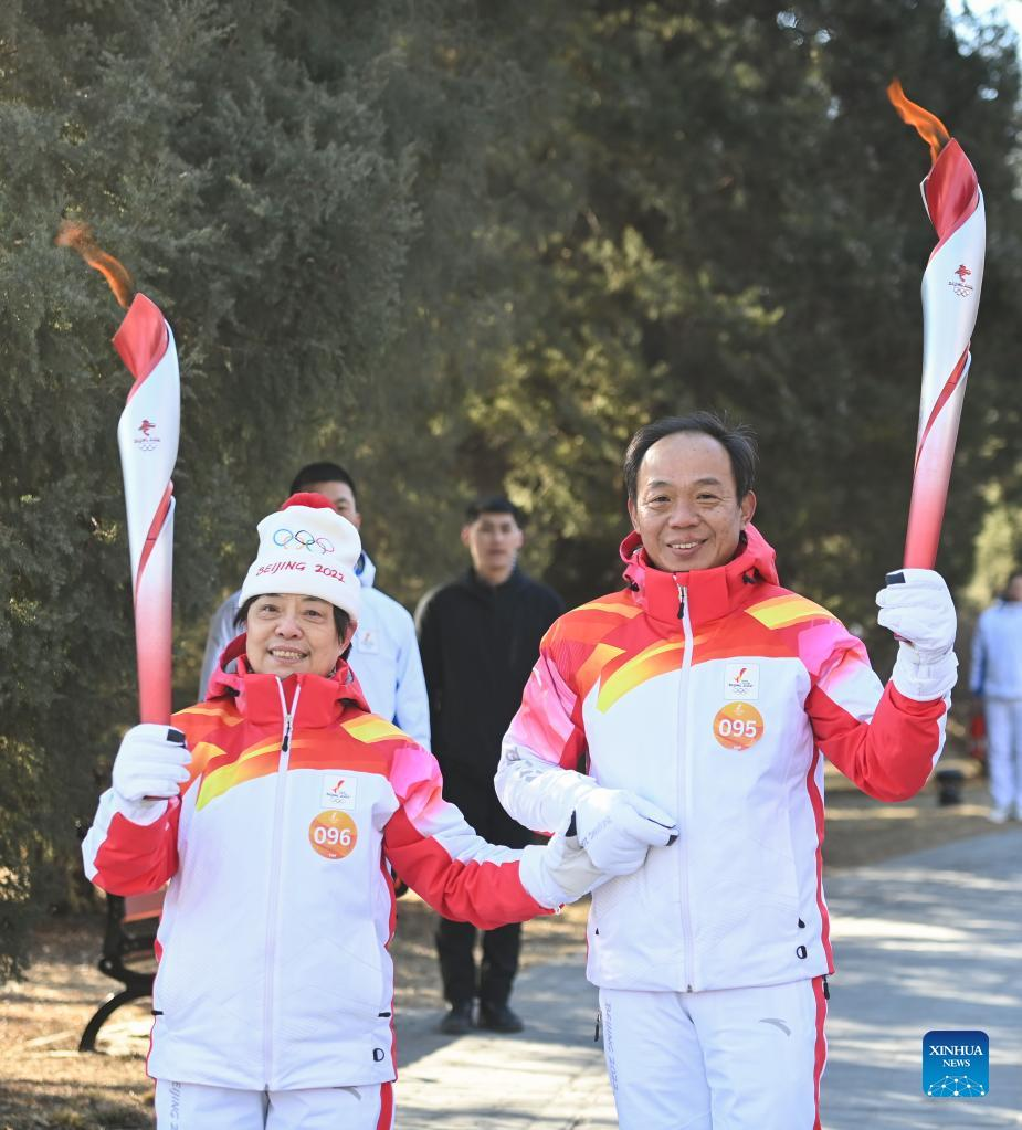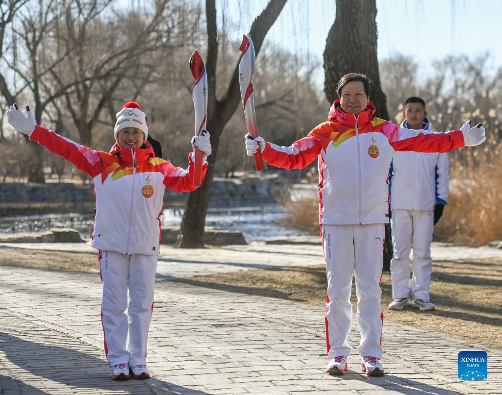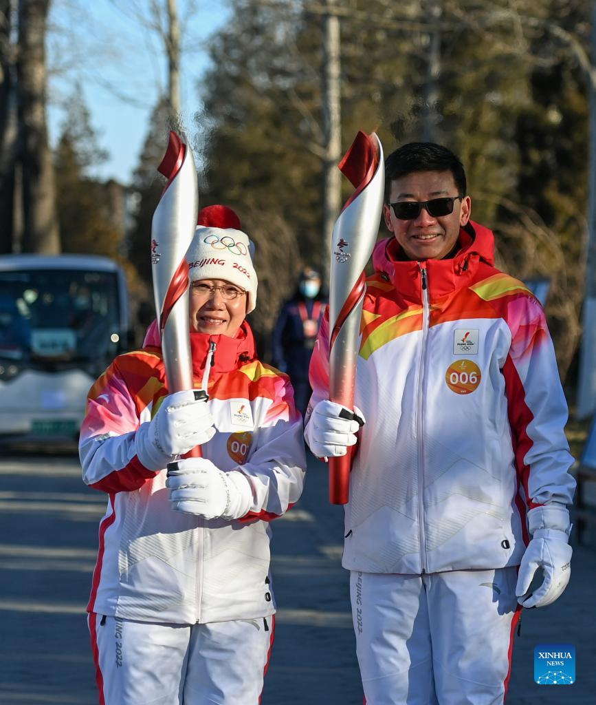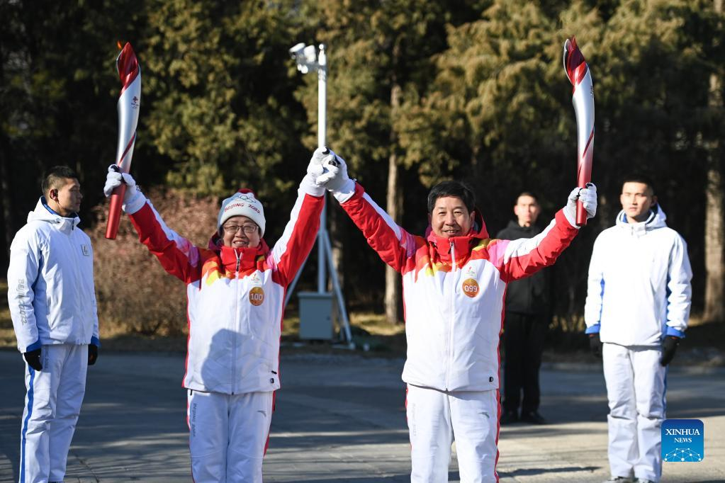 Torch bearer Zhang Lijun (R front) and Zhen Lei attend the Beijing 2022 Olympic Torch Relay at the Summer Palace in Beijing, Feb. 4, 2022. (Xinhua/Chen Yehua)