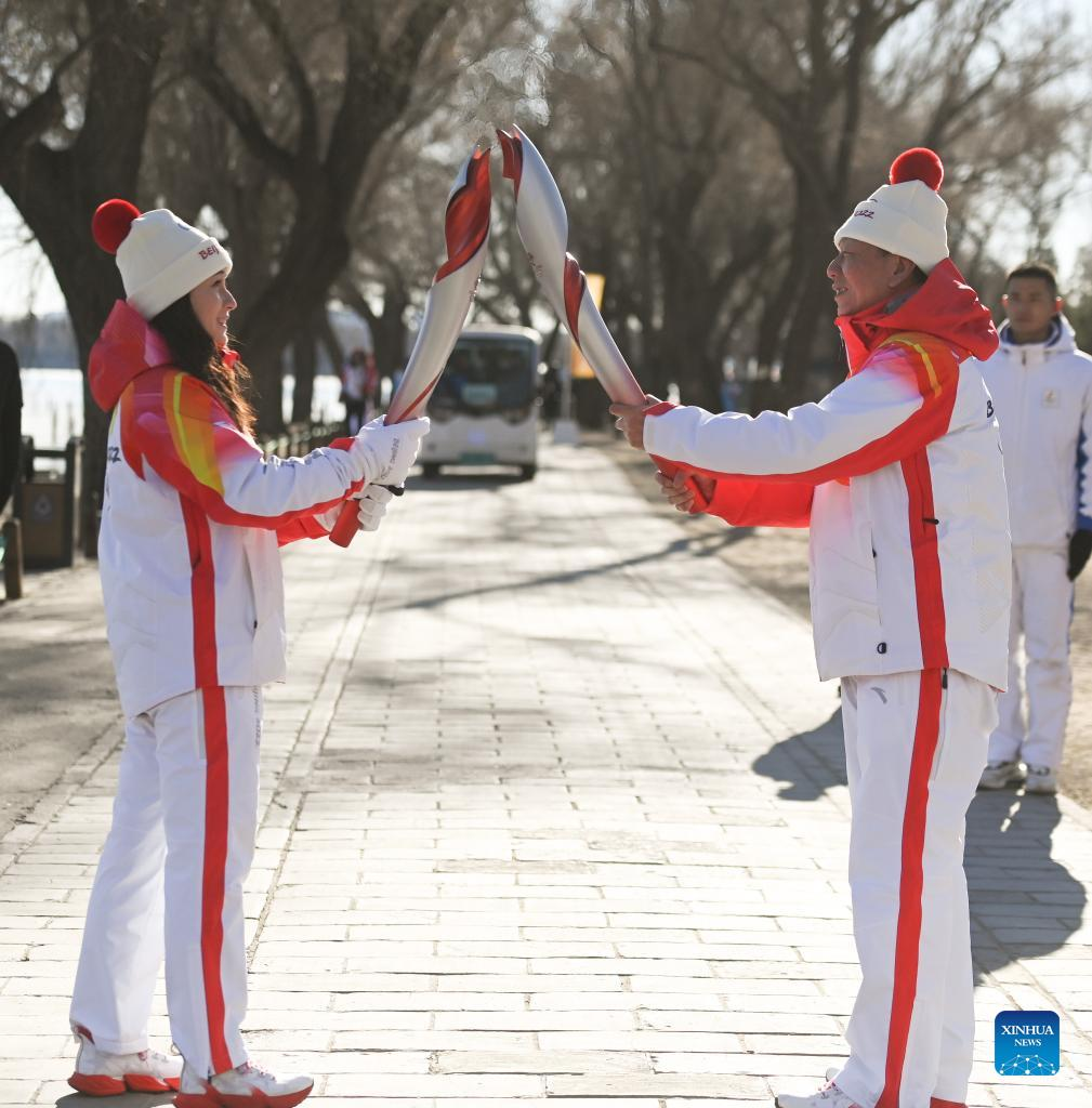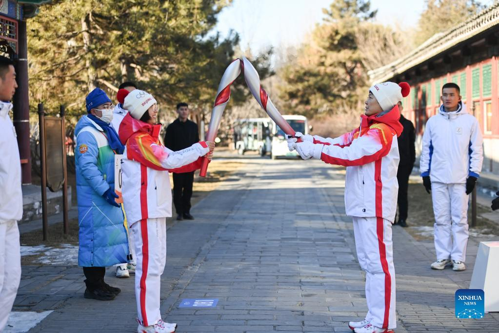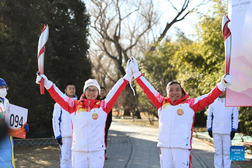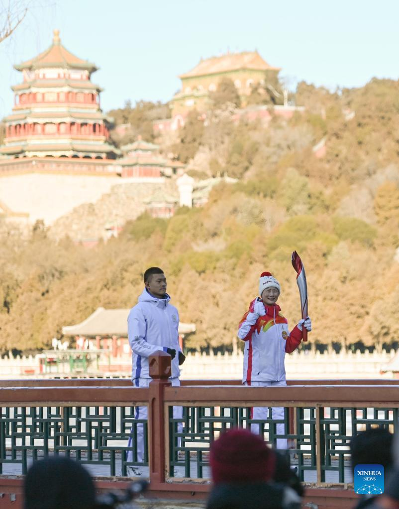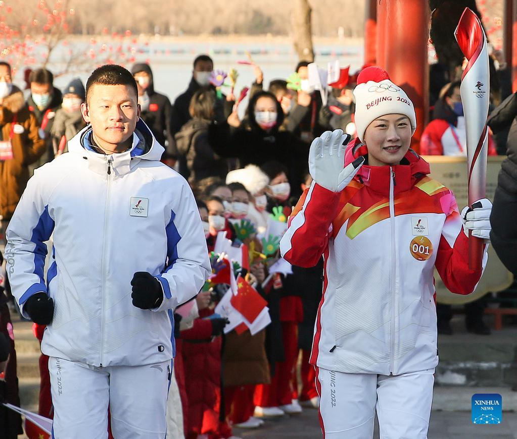 Torch bearer Zhang Lijun (R front) and Zhen Lei attend the Beijing 2022 Olympic Torch Relay at the Summer Palace in Beijing, Feb. 4, 2022. (Xinhua/Chen Yehua)