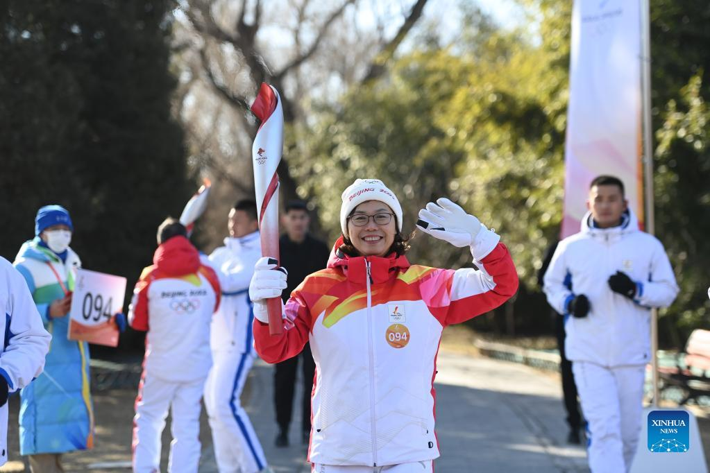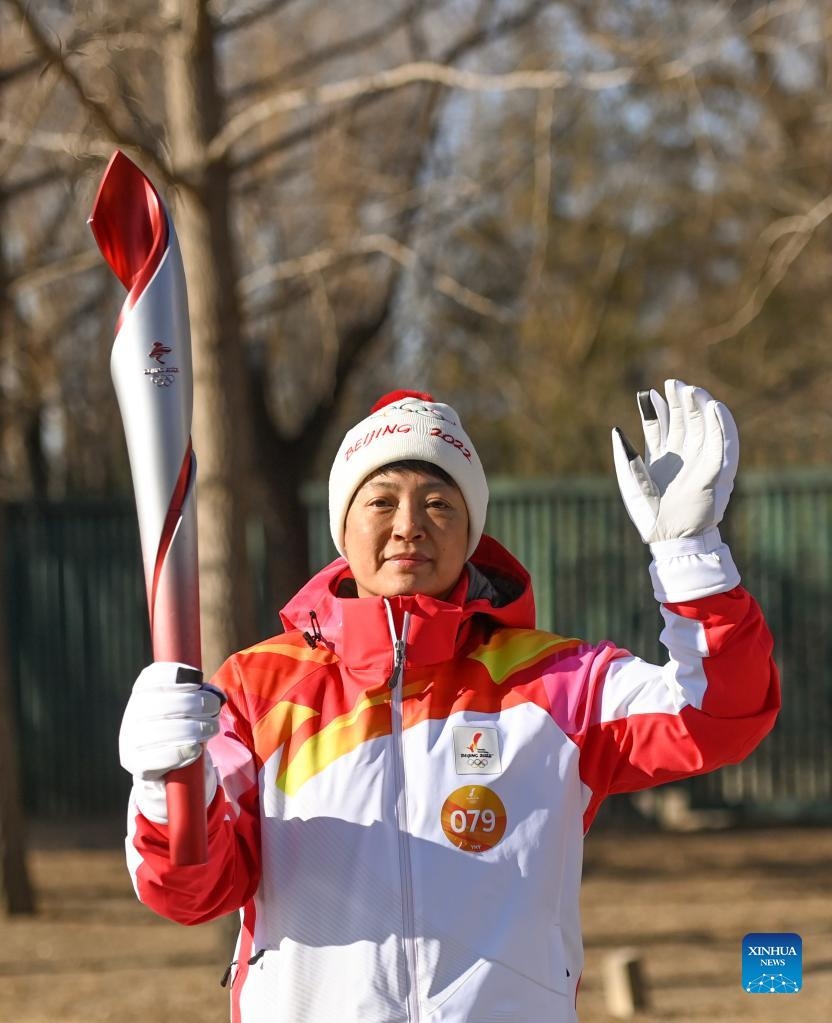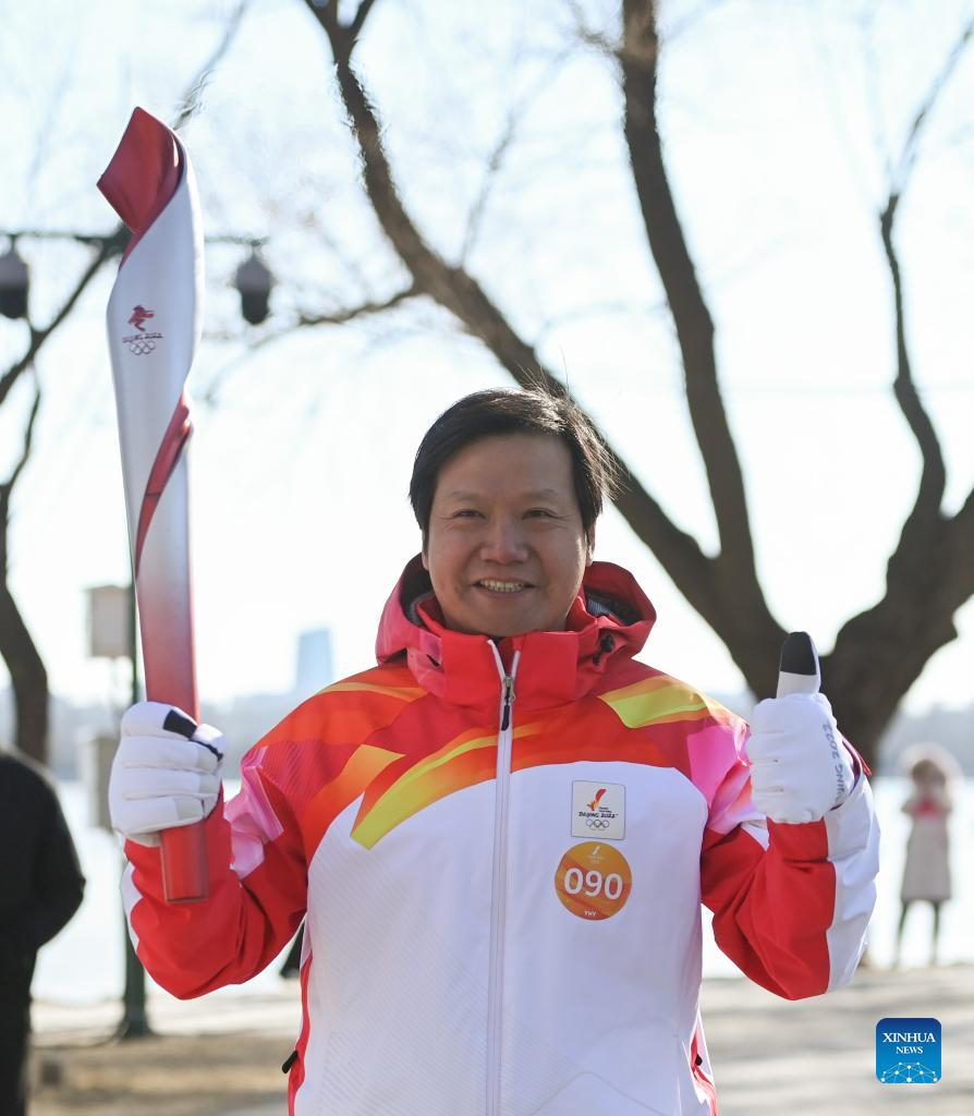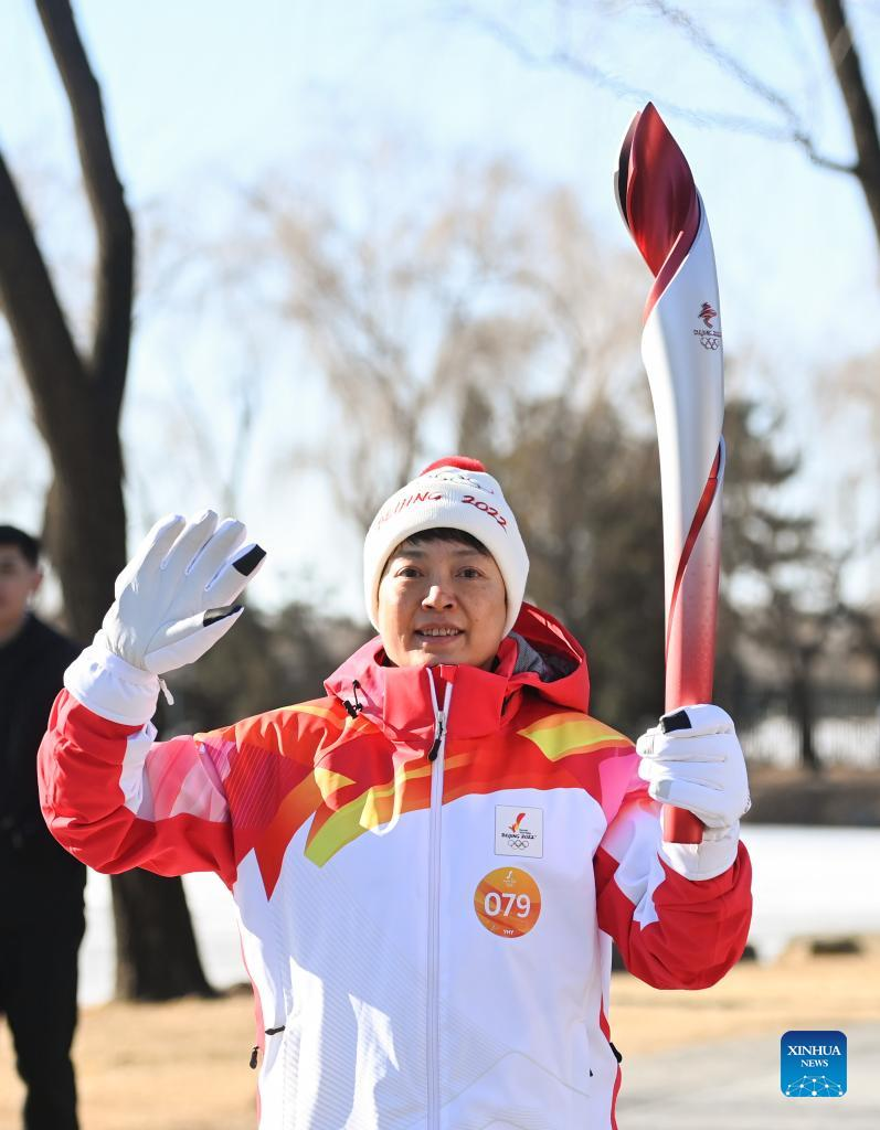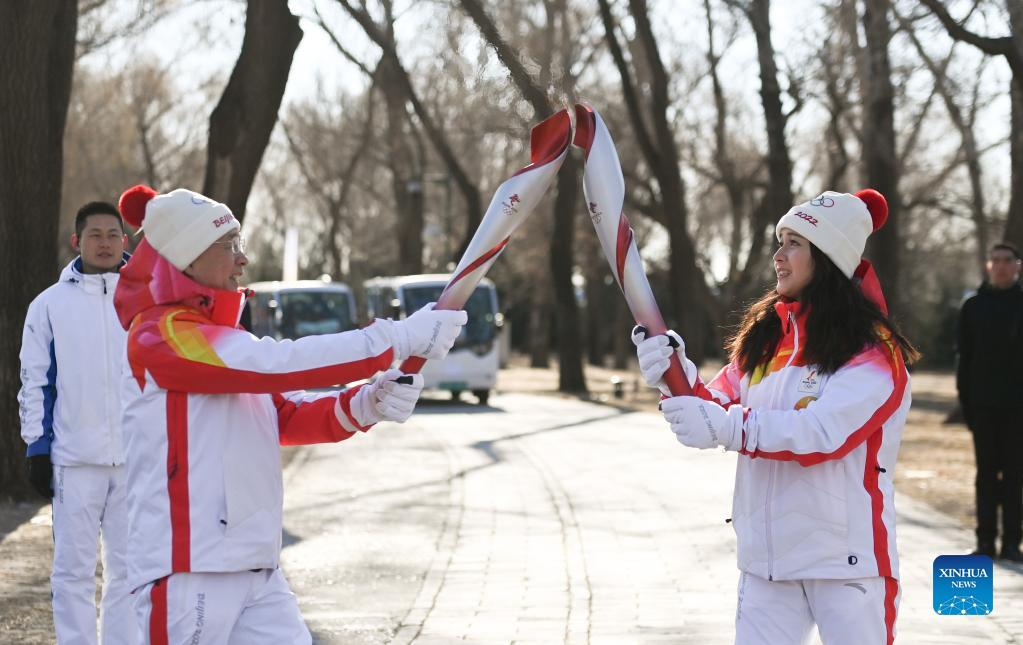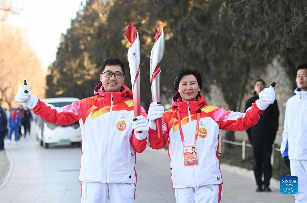 Torch bearer Zhang Lijun (R front) and Zhen Lei attend the Beijing 2022 Olympic Torch Relay at the Summer Palace in Beijing, Feb. 4, 2022. (Xinhua/Chen Yehua)