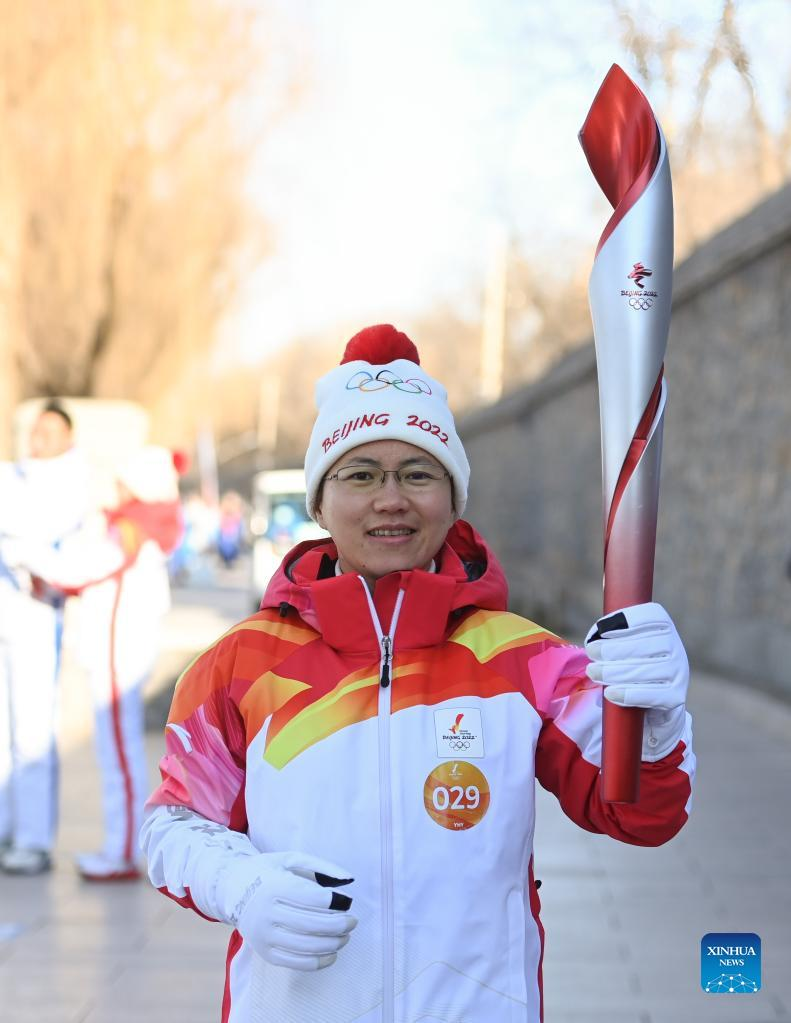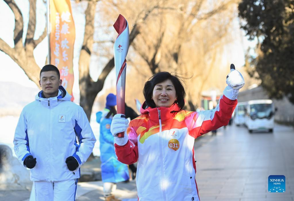 Torch bearer Zhu Shuanghong runs with the torch during the Beijing 2022 Olympic Torch Relay at the Summer Palace in Beijing, capital of China, Feb. 4, 2022. (Xinhua/Chen Yehua)