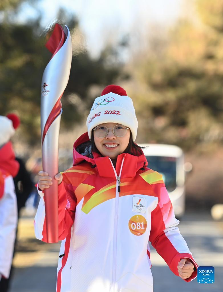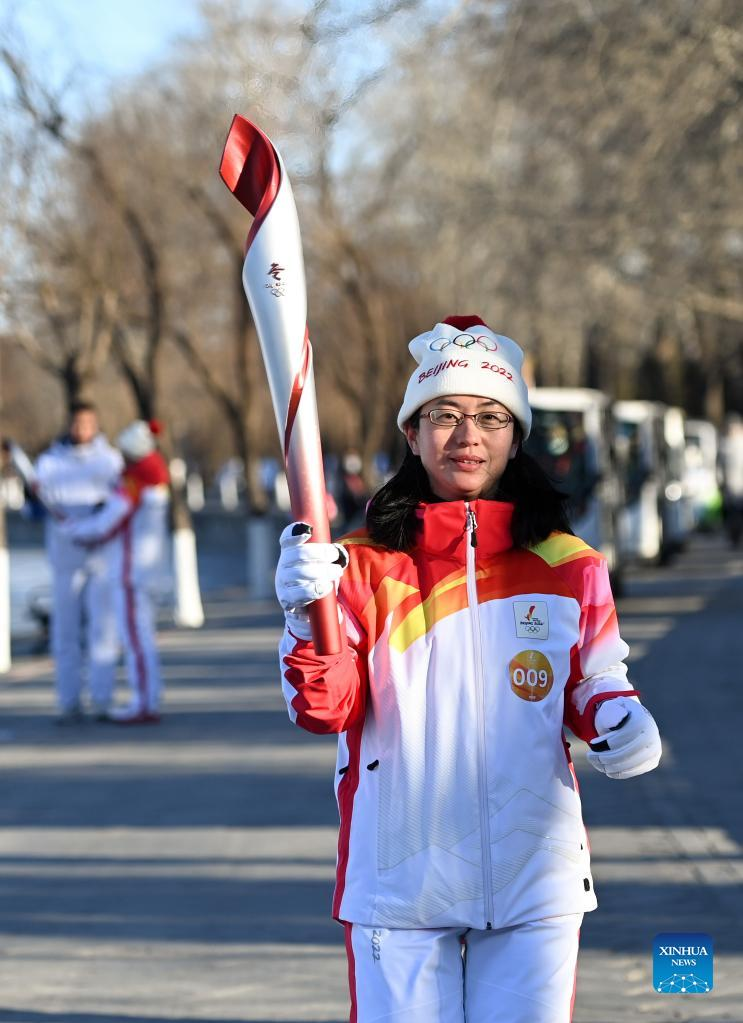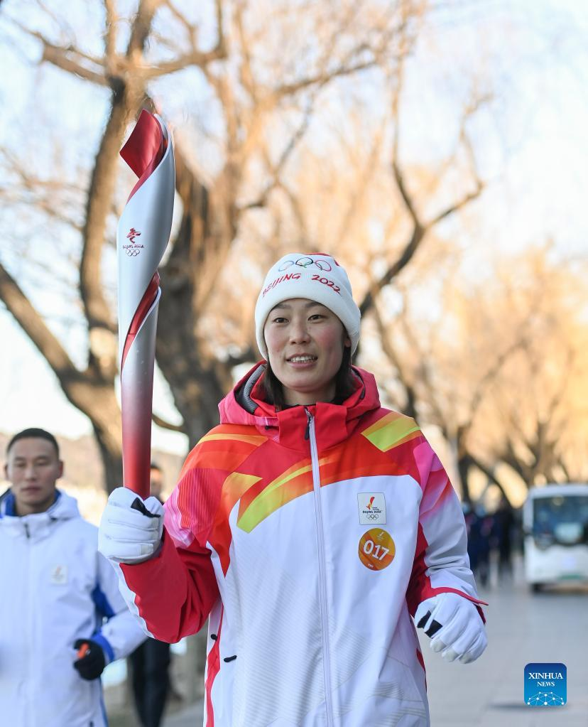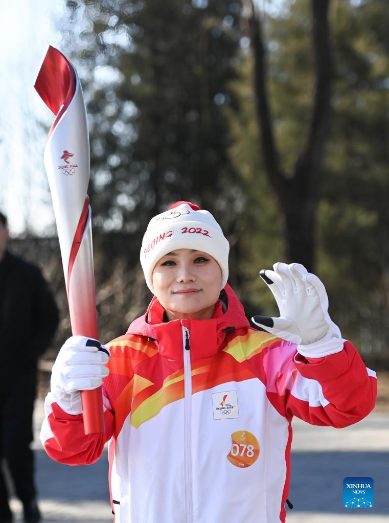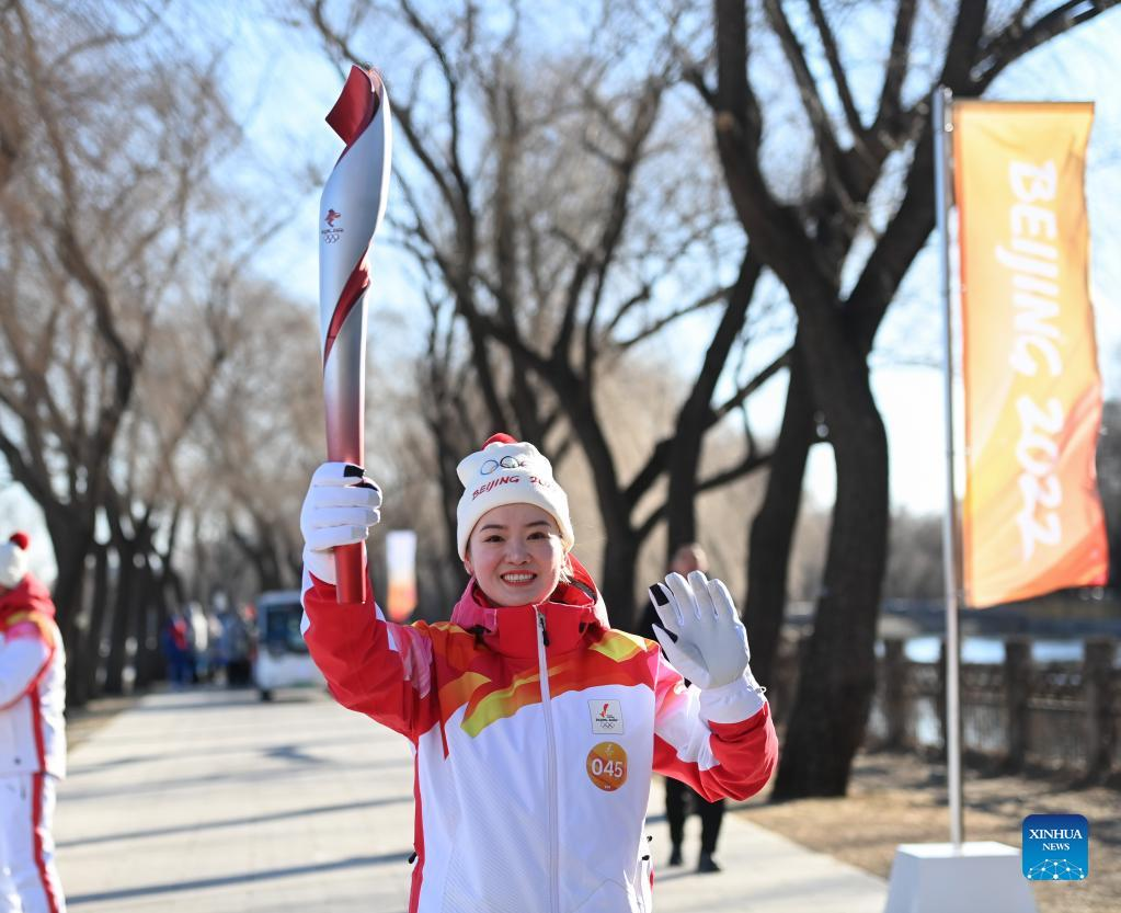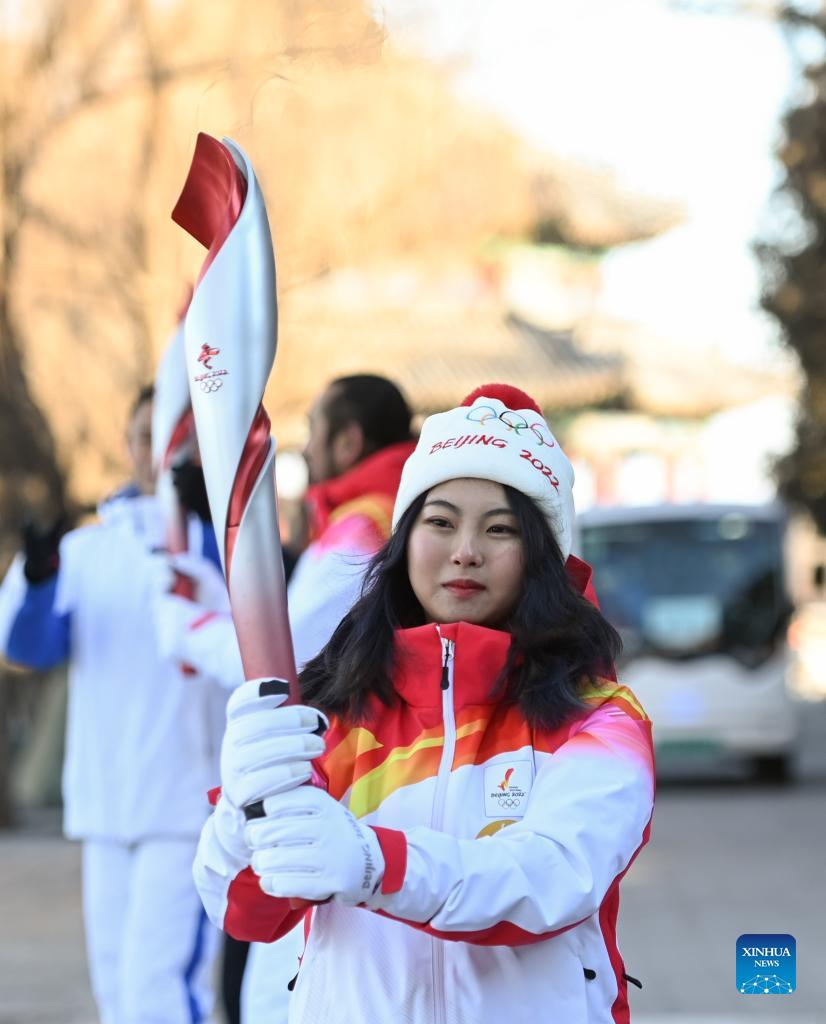 Torch bearer Zhu Ting runs with the torch during the Beijing 2022 Olympic Torch Relay at the Summer Palace in Beijing, capital of China, Feb. 4, 2022. (Xinhua/Chen Yehua)
