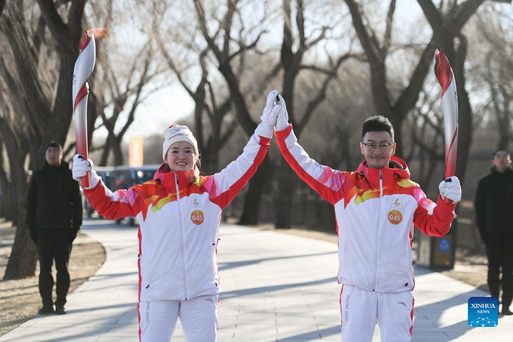 Torch bearers Zhu Dongyun (R) and Li Su attend the Beijing 2022 Olympic Torch Relay at the Summer Palace in Beijing, capital of China, Feb. 4, 2022. (Xinhua/Chen Yehua)