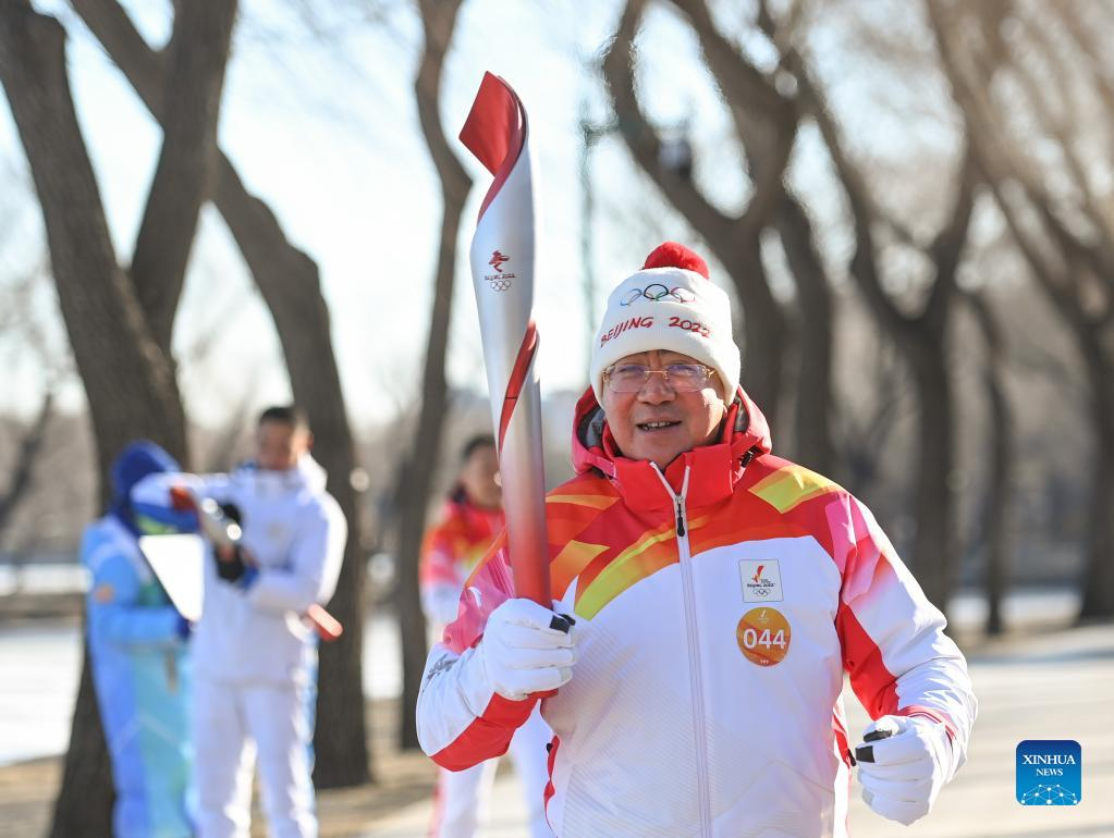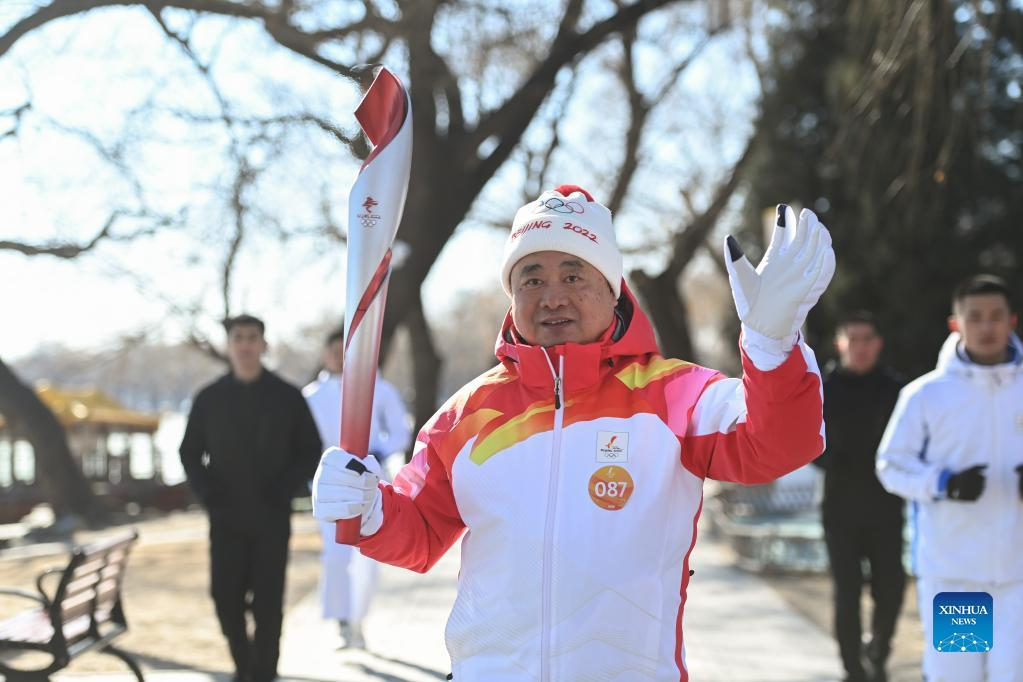 Torch bearer Shang Xiping runs with the torch during the Beijing 2022 Olympic Torch Relay at the Summer Palace in Beijing, capital of China, Feb. 4, 2022. (Xinhua/Chen Yehua)