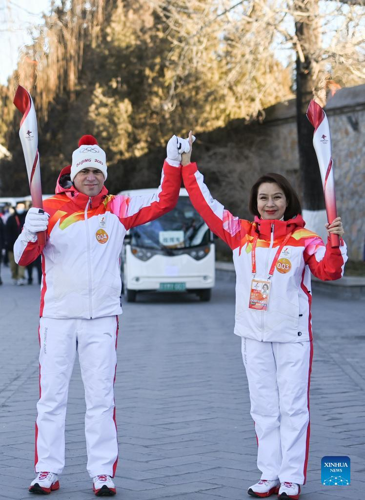 Torch bearers Zhu Dongyun (L) and Chen Zhongwei attend the Beijing 2022 Olympic Torch Relay at the Summer Palace in Beijing, capital of China, Feb. 4, 2022. (Xinhua/Chen Yehua)