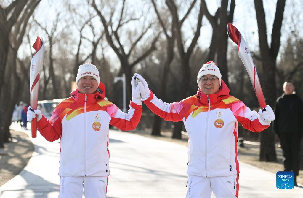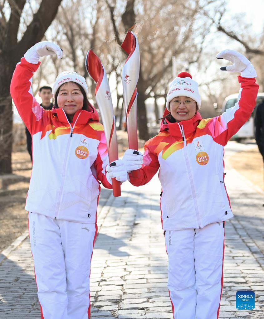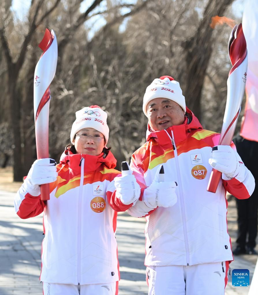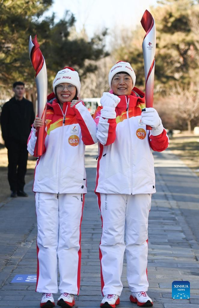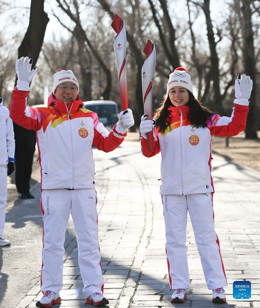 Torch bearer Wang Xiaolan (R front) and Mao Daqing attend the Beijing 2022 Olympic Torch Relay at the Summer Palace in Beijing, Feb. 4, 2022. (Xinhua/Chen Yehua)