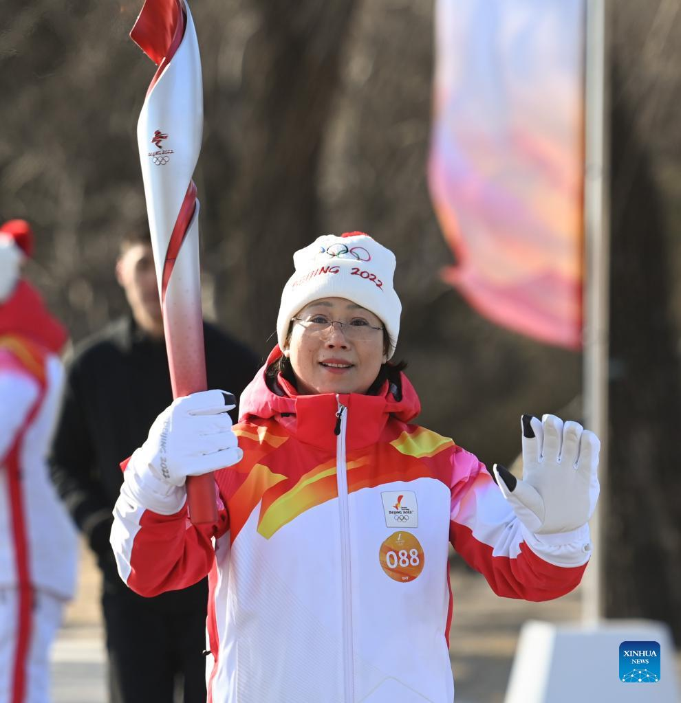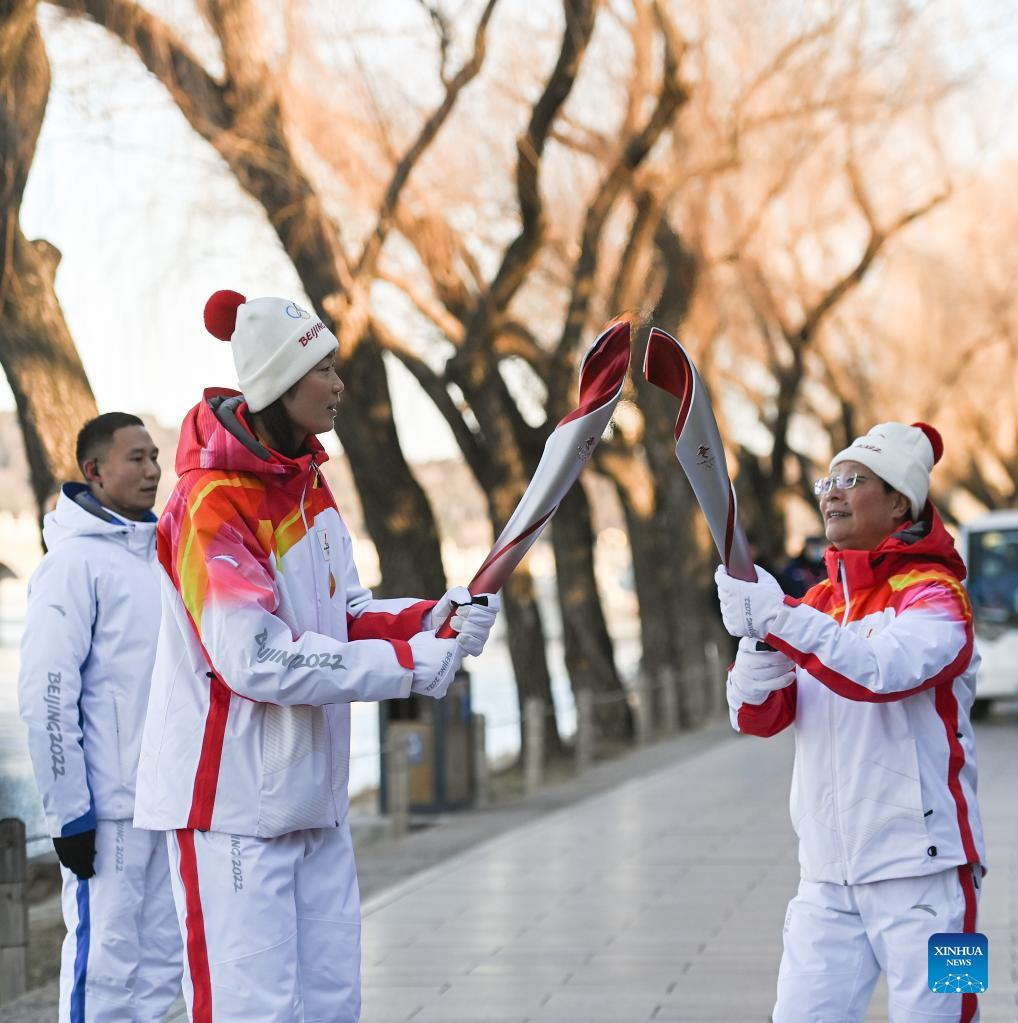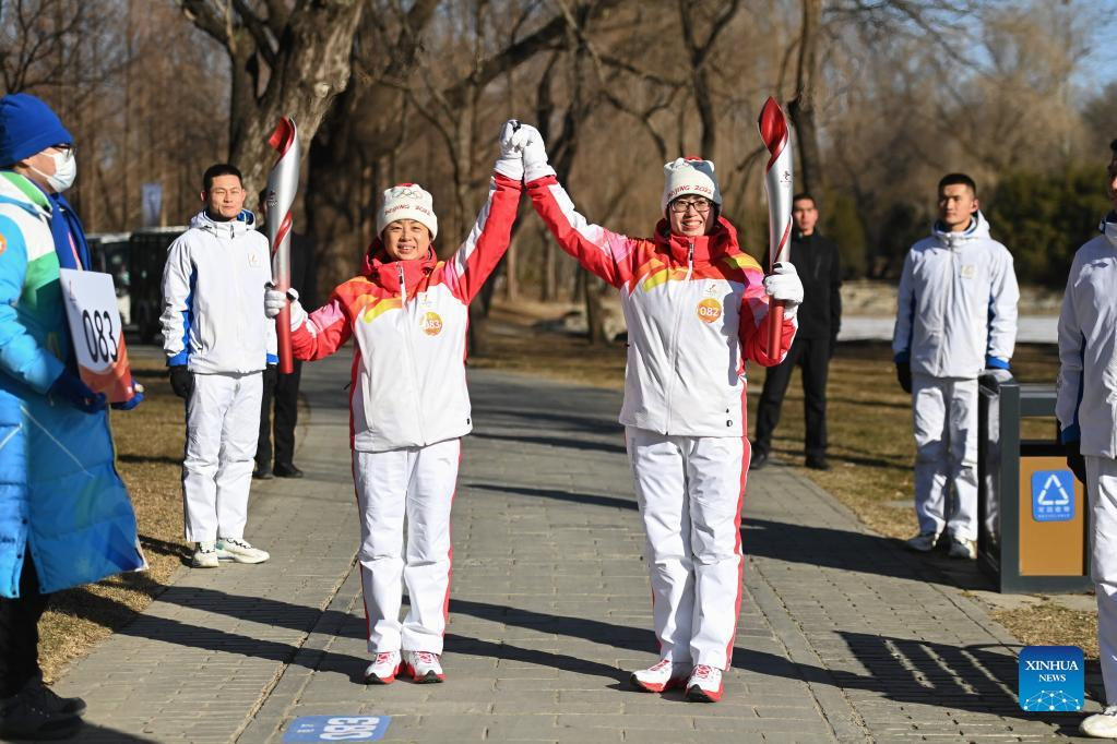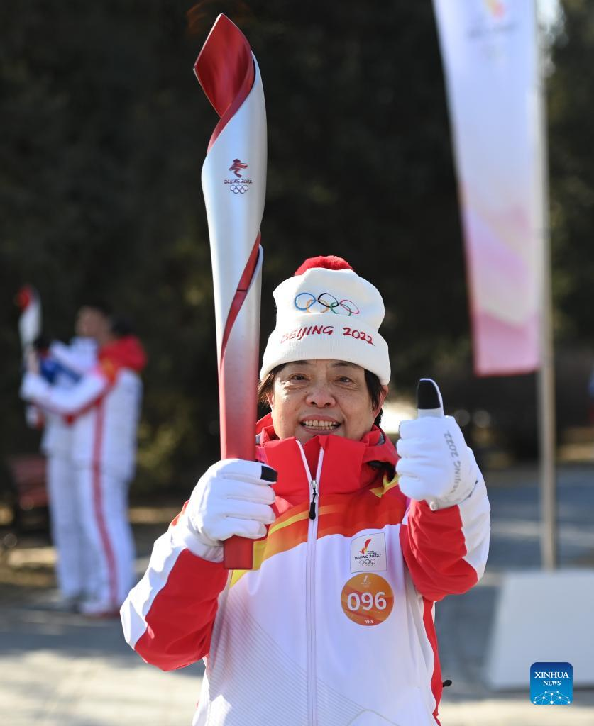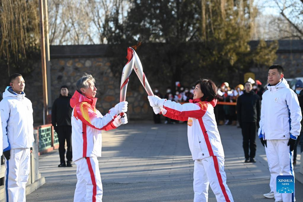 Torch bearer Wang Xiaolan (R front) and Mao Daqing attend the Beijing 2022 Olympic Torch Relay at the Summer Palace in Beijing, Feb. 4, 2022. (Xinhua/Chen Yehua)