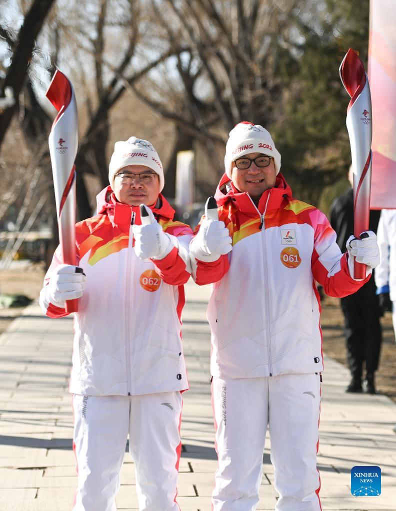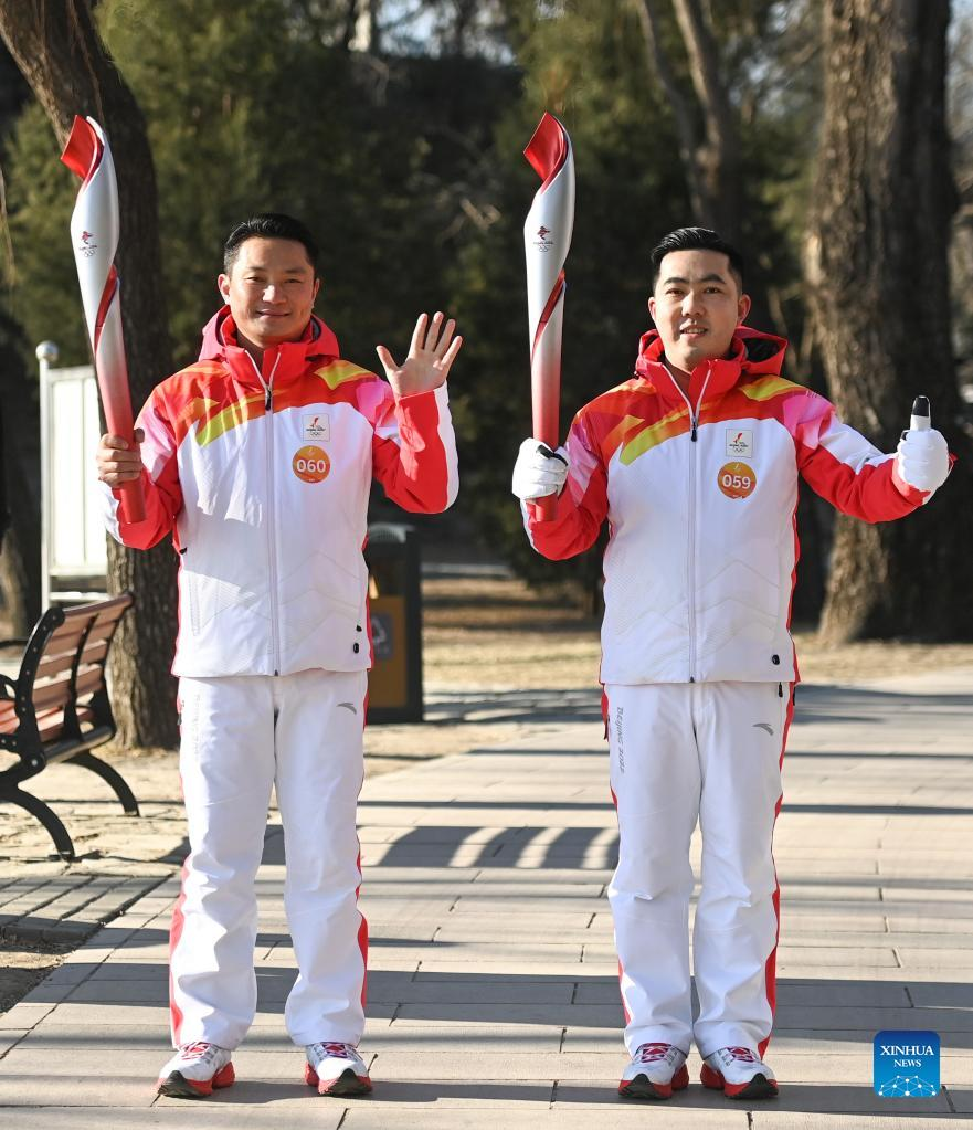 Torch bearers Xu Yang (R) and Wang Zhiyong attend the Beijing 2022 Olympic Torch Relay at the Summer Palace in Beijing, capital of China, Feb. 4, 2022. (Xinhua/Chen Yehua)