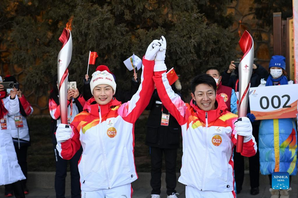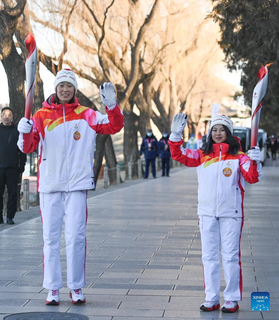 Torch bearer Li Jing (R front) and Liu Chang attend the Beijing 2022 Olympic Torch Relay at Summer Palace in Beijing, capital of China, Feb. 4, 2022.