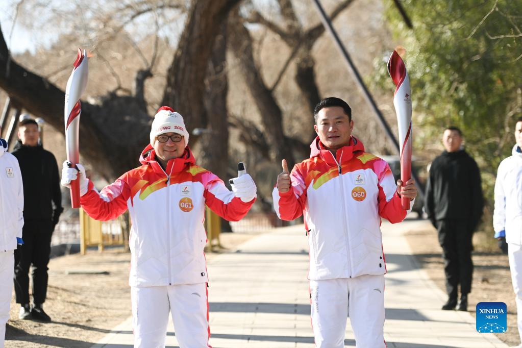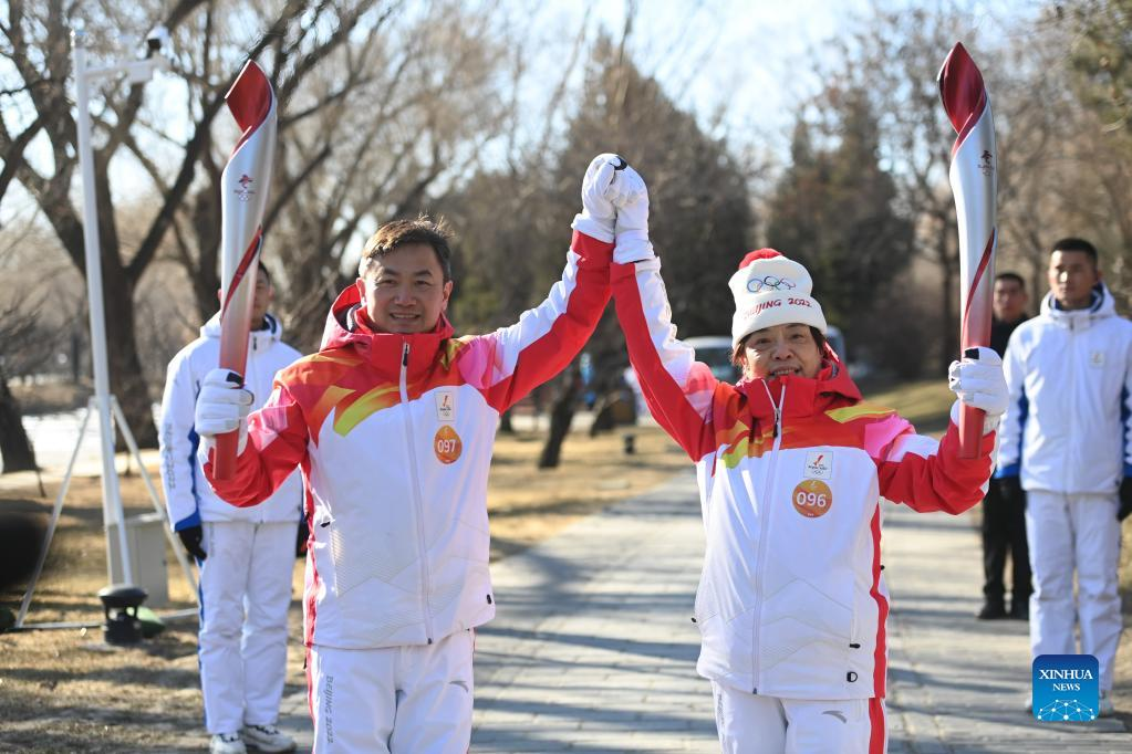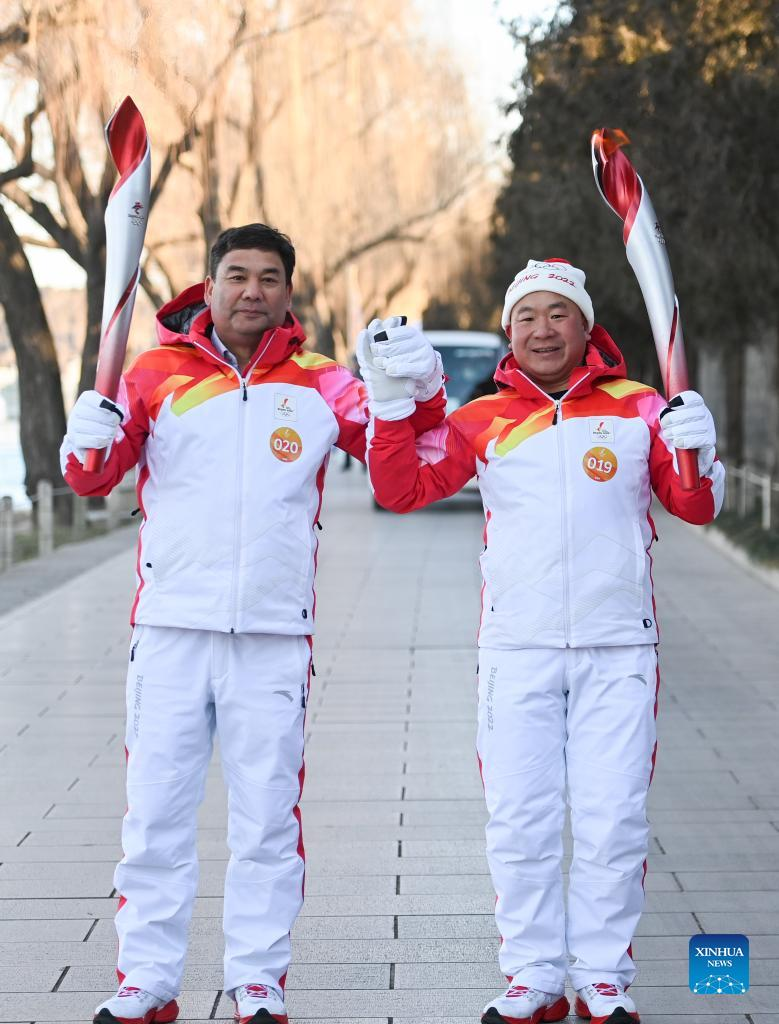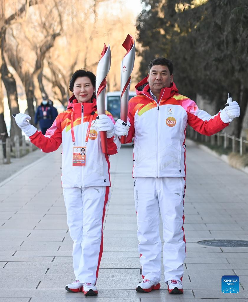 Torch bearer Zhang Lijun (R) and Zhen Lei attend the Beijing 2022 Olympic Torch Relay at the Summer Palace in Beijing, Feb. 4, 2022. (Xinhua/Chen Yehua)