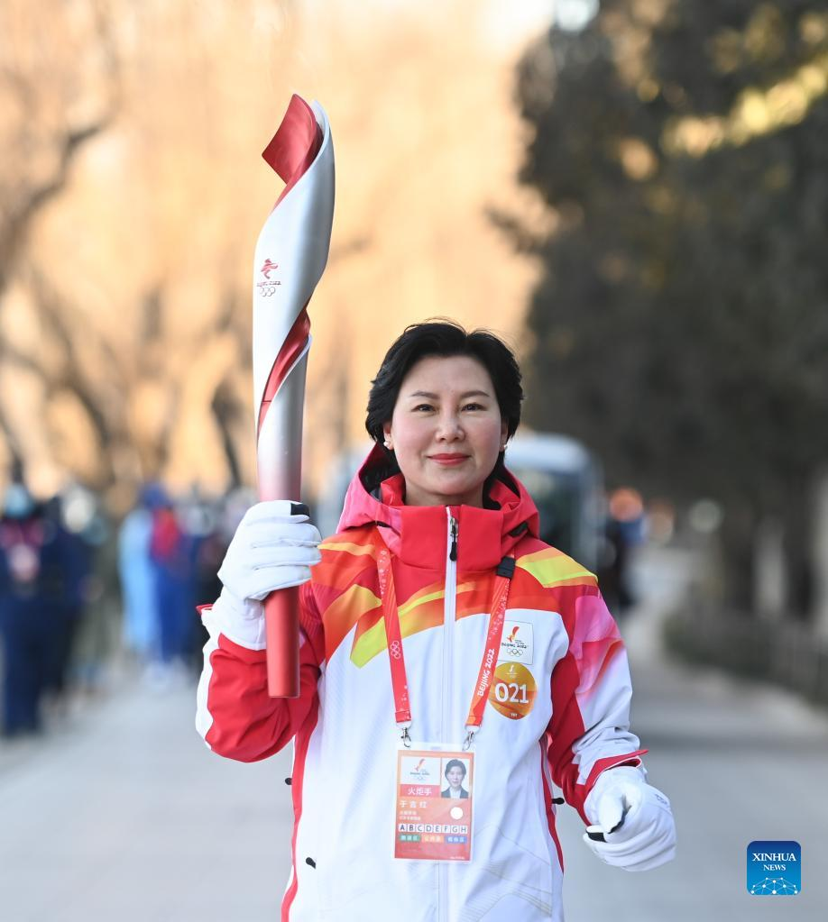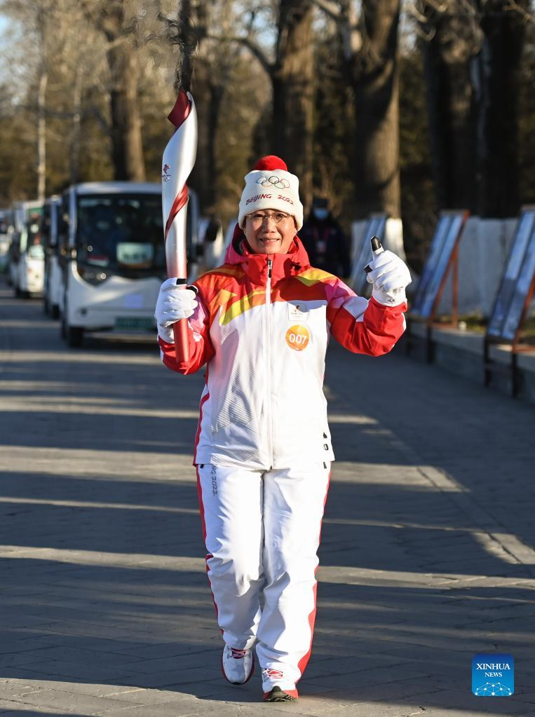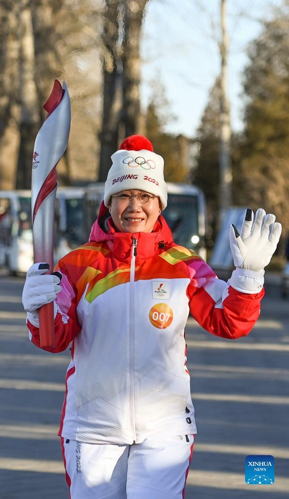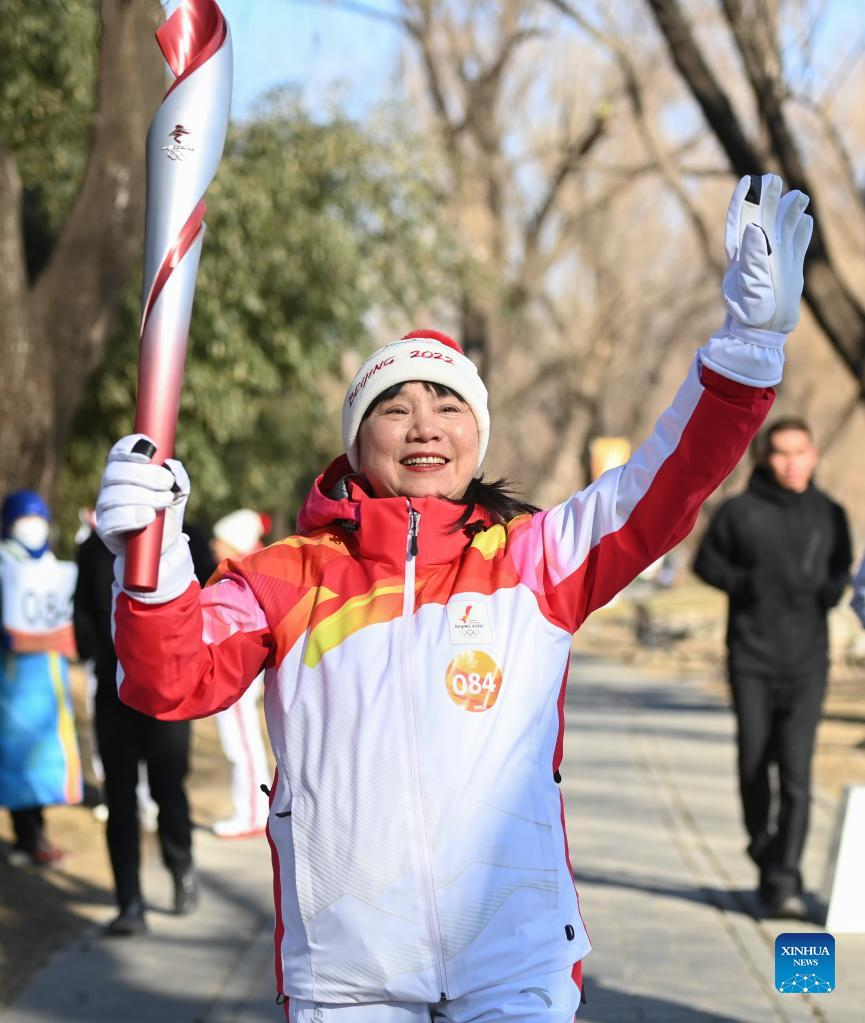 Torch bearer Yu Jihong runs with the torch during the Beijing 2022 Olympic Torch Relay at the Summer Palace in Beijing, capital of China, Feb. 4, 2022. (Xinhua/Chen Yehua)