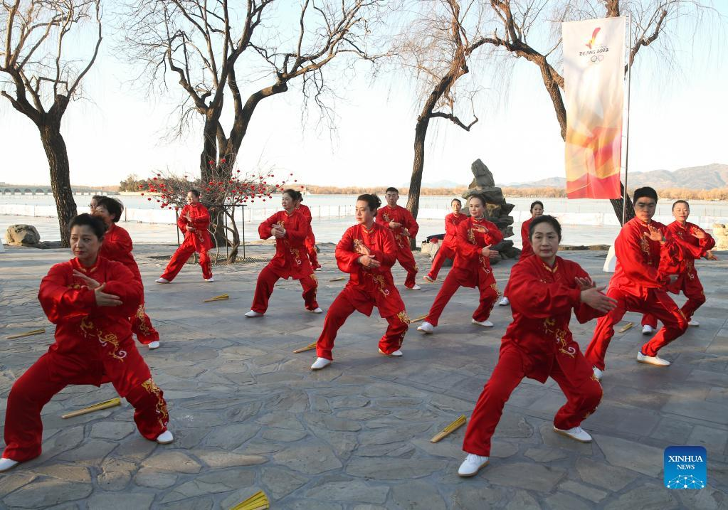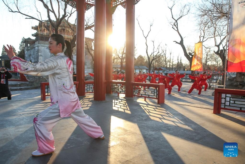 Performers show martial arts prior to the Beijing 2022 Olympic Torch Relay at the Summer Palace in Beijing, Capital of China, Feb. 4, 2022. (Xinhua/Jia Haocheng)