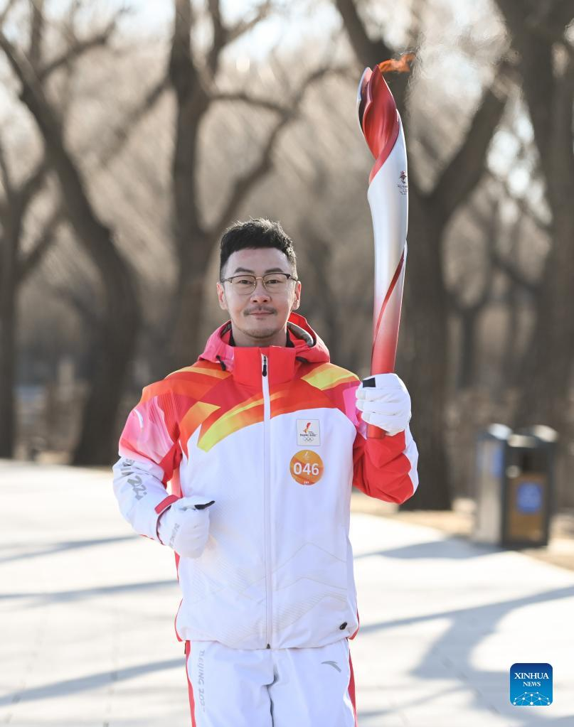 Torch bear Ke Yufa runs with the torch during the Beijing 2022 Olympic Torch Relay at the Summer Palace in Beijing, capital of China, Feb. 4, 2022. (Xinhua/Chen Yehua)