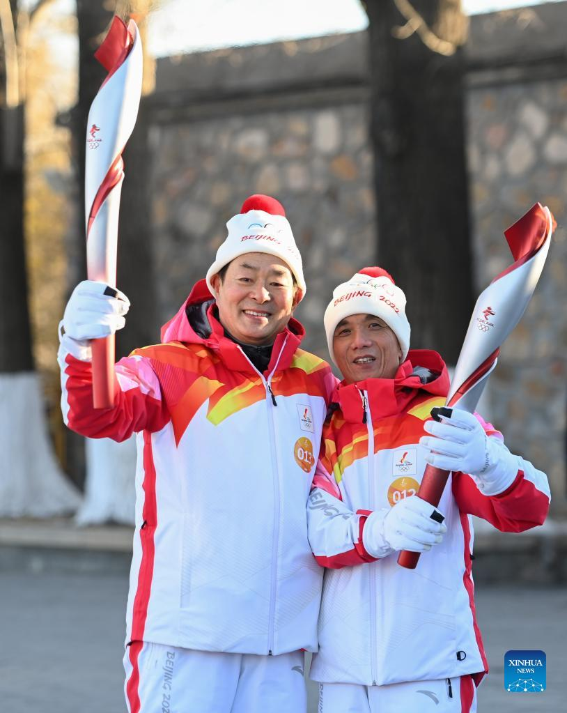 Torch bearers Li Jinsheng (R) and Ke Yufa attend the Beijing 2022 Olympic Torch Relay at the Summer Palace in Beijing, Capital of China, Feb. 4, 2022. (Xinhua/Chen Yehua)