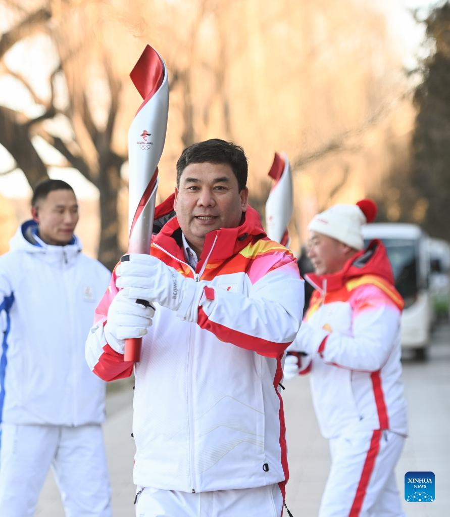 Torch bearer Dagu runs with the torch during the Beijing 2022 Olympic Torch Relay at the Summer Palace in Beijing, capital of China, Feb. 4, 2022. (Xinhua/Chen Yehua)