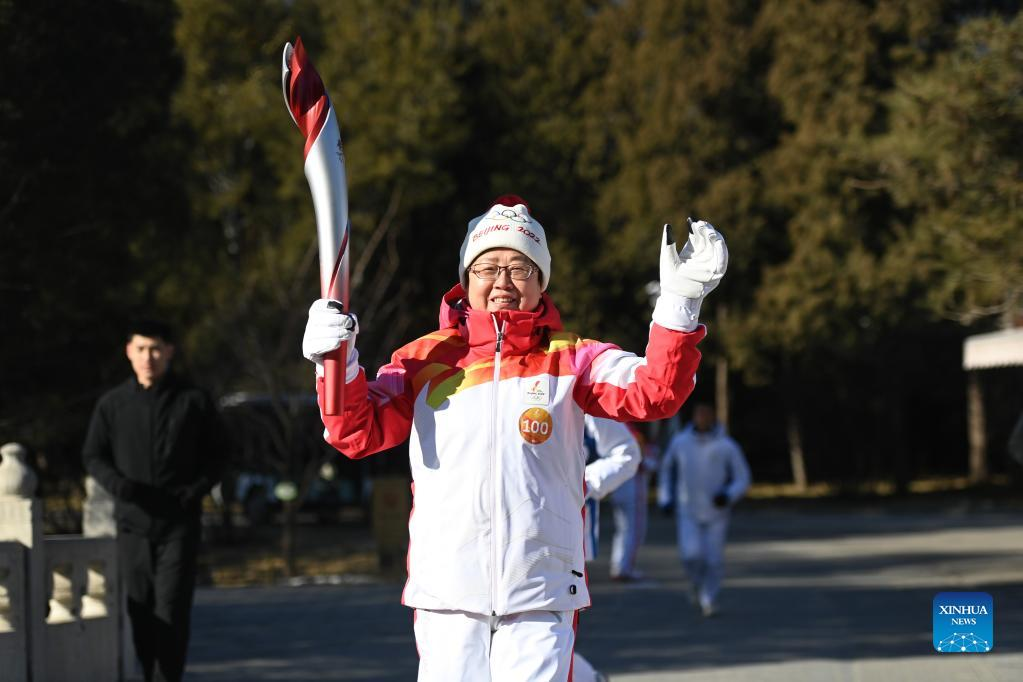 Torch bearer Tang Xiongyan runs with the torch during the Beijing 2022 Olympic Torch Relay at the Summer Palace in Beijing, capital of China, Feb. 4, 2022. (Xinhua/Chen Yehua)