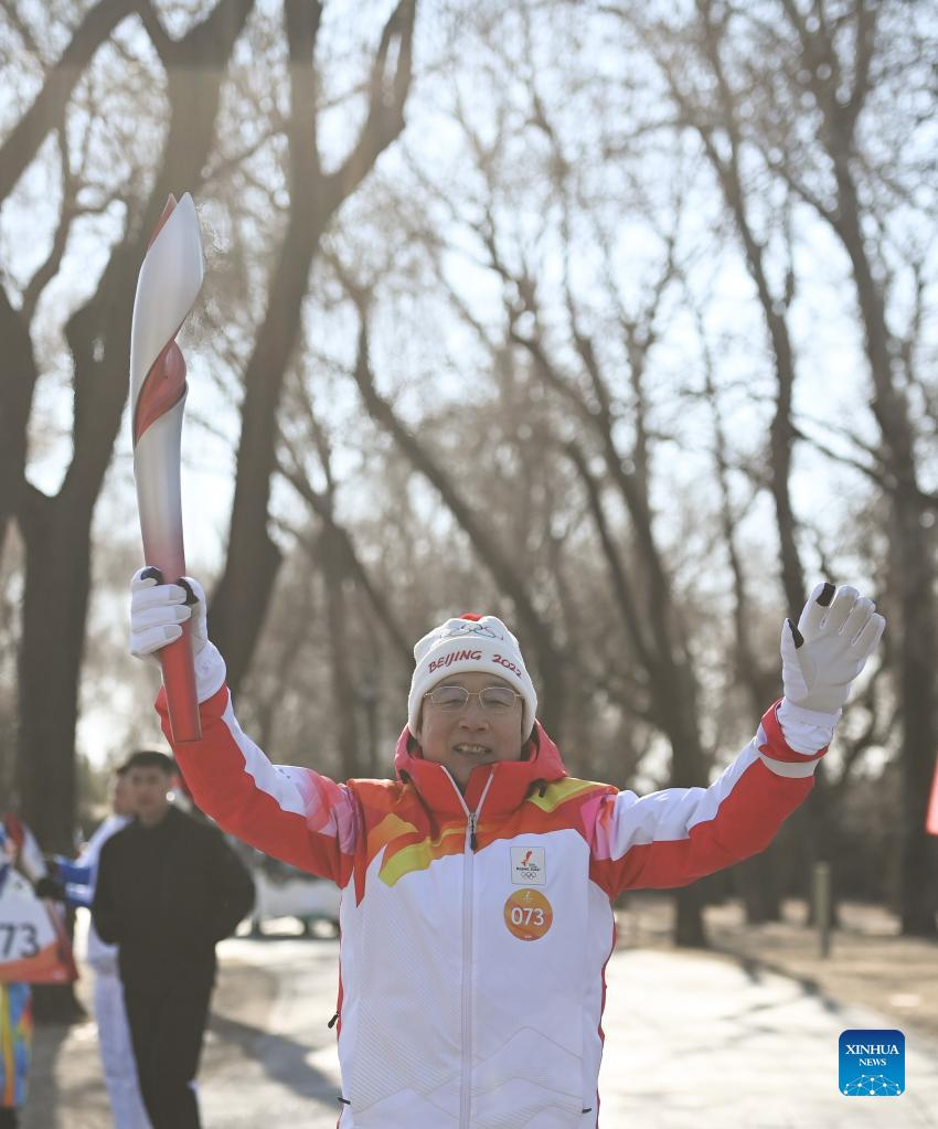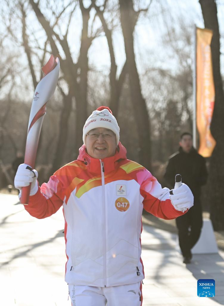 Torch bearer Tian Jihong runs with the torch during the Beijing 2022 Olympic Torch Relay at the Summer Palace in Beijing, capital of China, Feb. 4, 2022. (Xinhua/Chen Yehua)