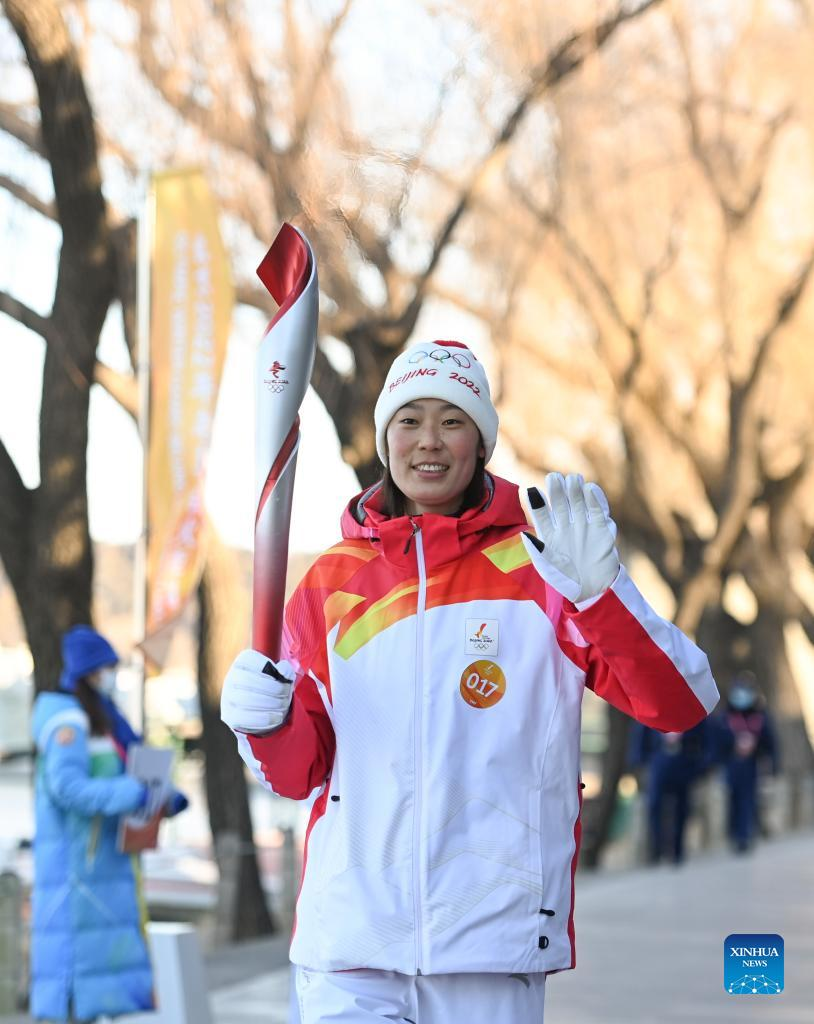Torch bearer Zhu Dongyun runs with the torch during the Beijing 2022 Olympic Torch Relay at the Summer Palace in Beijing, capital of China, Feb. 4, 2022. (Xinhua/Chen Yehua)
