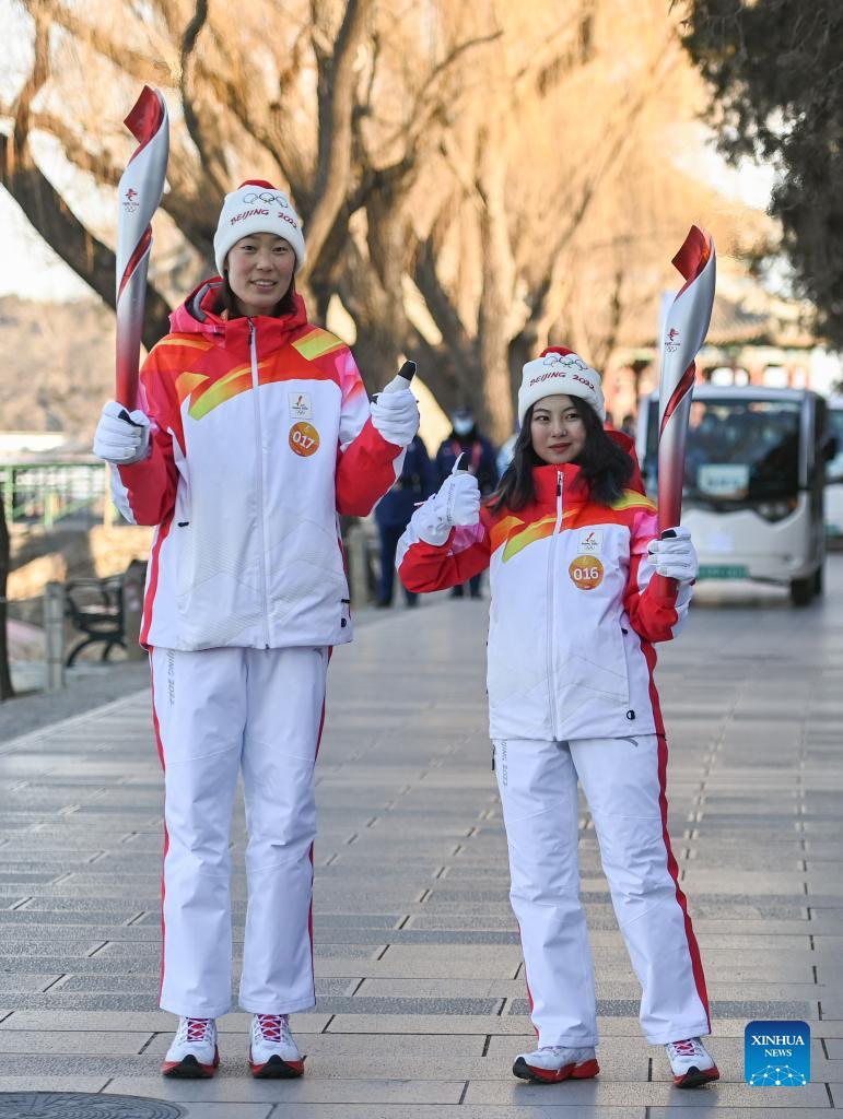Torch bearers Zhu Ting (L) and Lin Shiling attend the Beijing 2022 Olympic Torch Relay at the Summer Palace in Beijing, capital of China, Feb. 4, 2022. (Xinhua/Chen Yehua)
