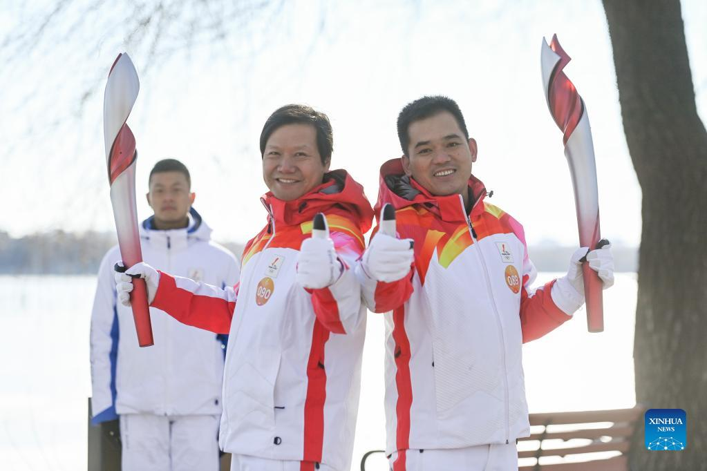 Torch bearer Lei Jun(R front) and Li Jing attend the Beijing 2022 Olympic Torch Relay at Summer Palace in Beijing, capital of China, Feb. 4, 2022. (Xinhua/Chen Yehua)