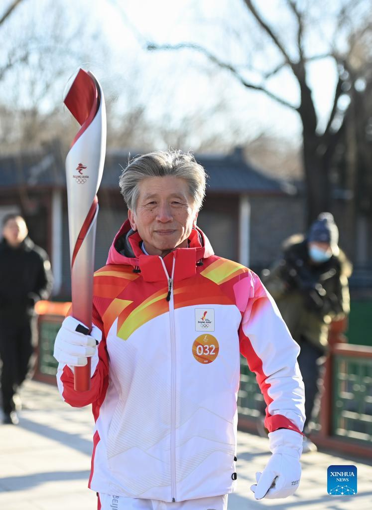Torch bearer Chi Xiaoqiu runs with the torch during the Beijing 2022 Olympic Torch Relay at the Summer Palace in Beijing, capital of China, Feb. 4, 2022. (Xinhua/Chen Yehua)