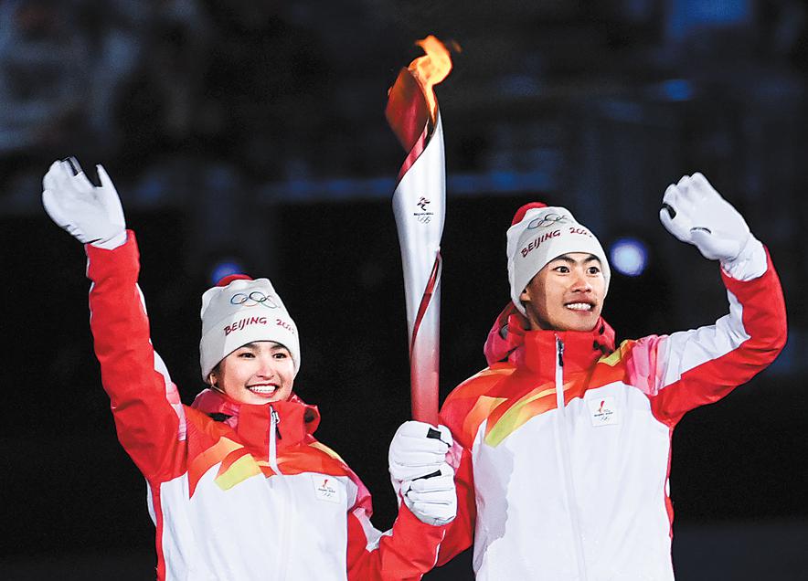 Torchbearer completes memorable 18 hours By Yang Zekun in Beijing and Cui Jia in Zhangjiakou | chinadaily.com.cn | Updated: 2022-02-06 21:55 Dinigeer Yilamujiang (left) and Zhao Jiawen, a men’s Nordic combined athlete, at the opening ceremony on Friday night. LI GA / XINHUA