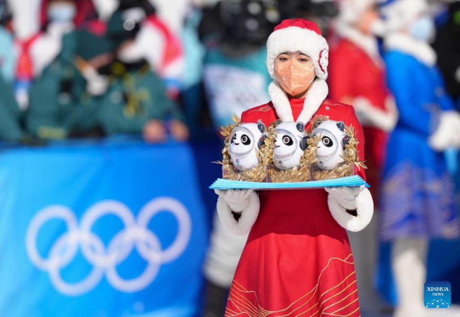 A staff member holding mascots to be awarded to winning athletes of the women's snowboard slopestyle final is seen during the flower ceremony at the Genting Snow Park in Zhangjiakou, north China's Hebei Province, Feb. 6, 2022. (Xinhua/Xue Yubin)