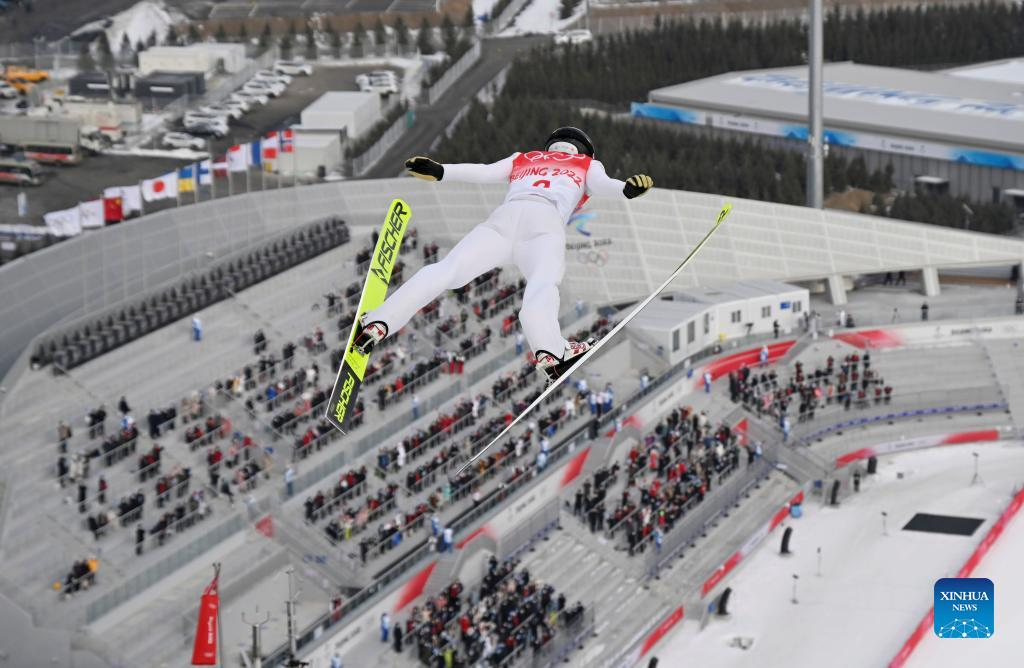 Lukas Greiderer of Austria competes during Nordic Combined Individual Gundersen Normal Hill/10km, Ski Jumping Competition Round at the National Ski Jumping Centre in Zhangjiakou, north China's Hebei Province, Feb. 9, 2022. (Xinhua/Dai Tianfang)