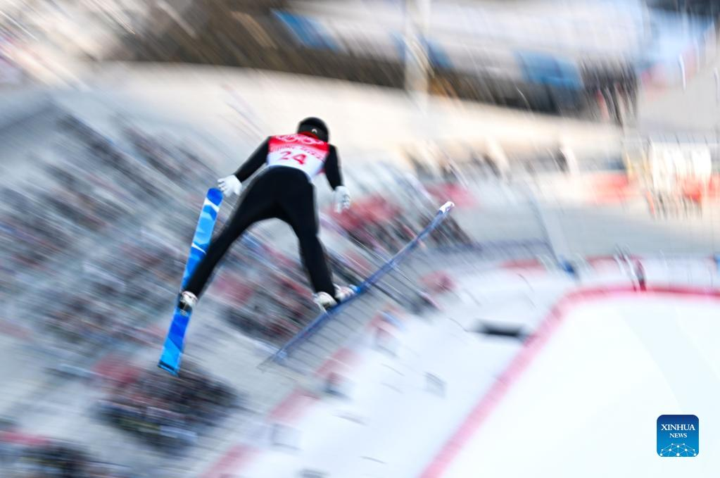 Zhao Jiawen of China competes during Nordic Combined Individual Gundersen Normal Hill/10km, Ski Jumping Competition Round at the National Ski Jumping Centre in Zhangjiakou, north China's Hebei Province, Feb. 9, 2022. (Xinhua/Dai Tianfang)