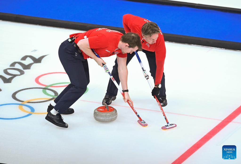 Torger Nergaard (R) of Norway competes during the Curling Men's Round Robin Session 6 of the Beijing 2022 Winter Olympics between Norway and Sweden at the National Aquatics Centre in Beijing, capital of China, Feb. 13, 2022. (Xinhua/Huang Xiaobang)
