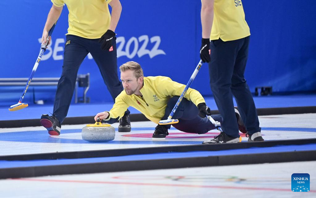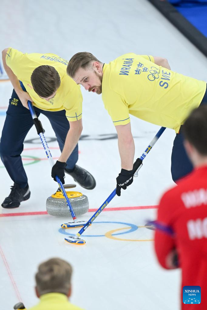 Rasmus Wranaa (R) of Sweden competes during the Curling Men's Round Robin Session 6 of the Beijing 2022 Winter Olympics between Norway and Sweden at the National Aquatics Centre in Beijing, capital of China, Feb. 13, 2022. (Xinhua/Huang Xiaobang)
