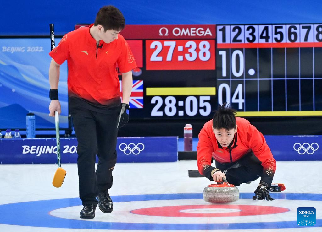 Zou Qiang (rear) of China competes during the Curling Men's Round Robin Session 6 of the Beijing 2022 Winter Olympics between China and Great Britain at the National Aquatics Centre in Beijing, capital of China, Feb. 13, 2022. (Xinhua/Huang Xiaobang)