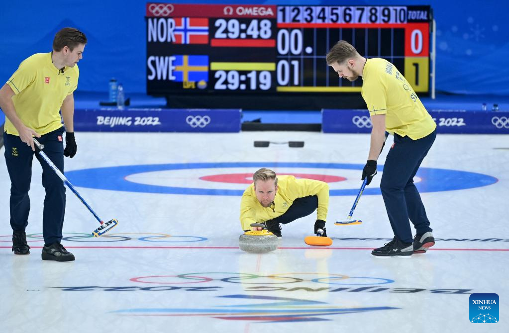 Niklas Edin (C) of Norway competes during the Curling Men's Round Robin Session 6 of the Beijing 2022 Winter Olympics between Norway and Sweden at the National Aquatics Centre in Beijing, capital of China, Feb. 13, 2022. (Xinhua/Huang Xiaobang)