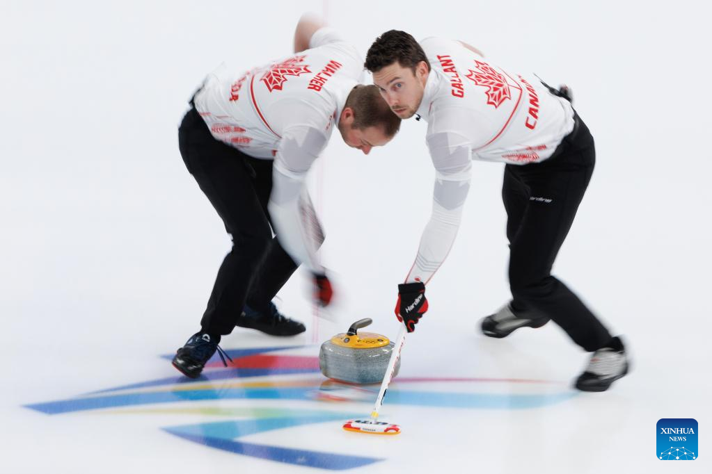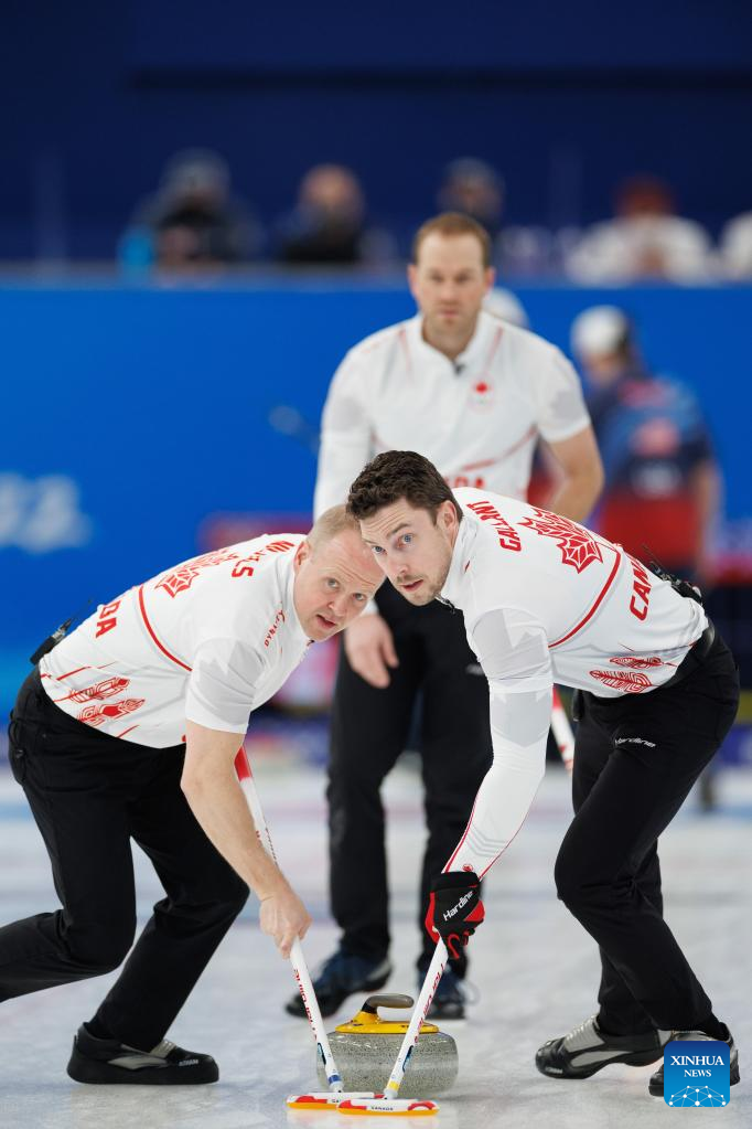 Brett Gallant (R) of Canada competes during the Curling Men's Round Robin Session 6 of the Beijing 2022 Winter Olympics between Canada and the United States at the National Aquatics Centre in Beijing, capital of China, Feb. 13, 2022. (Xinhua/Liu Xu)