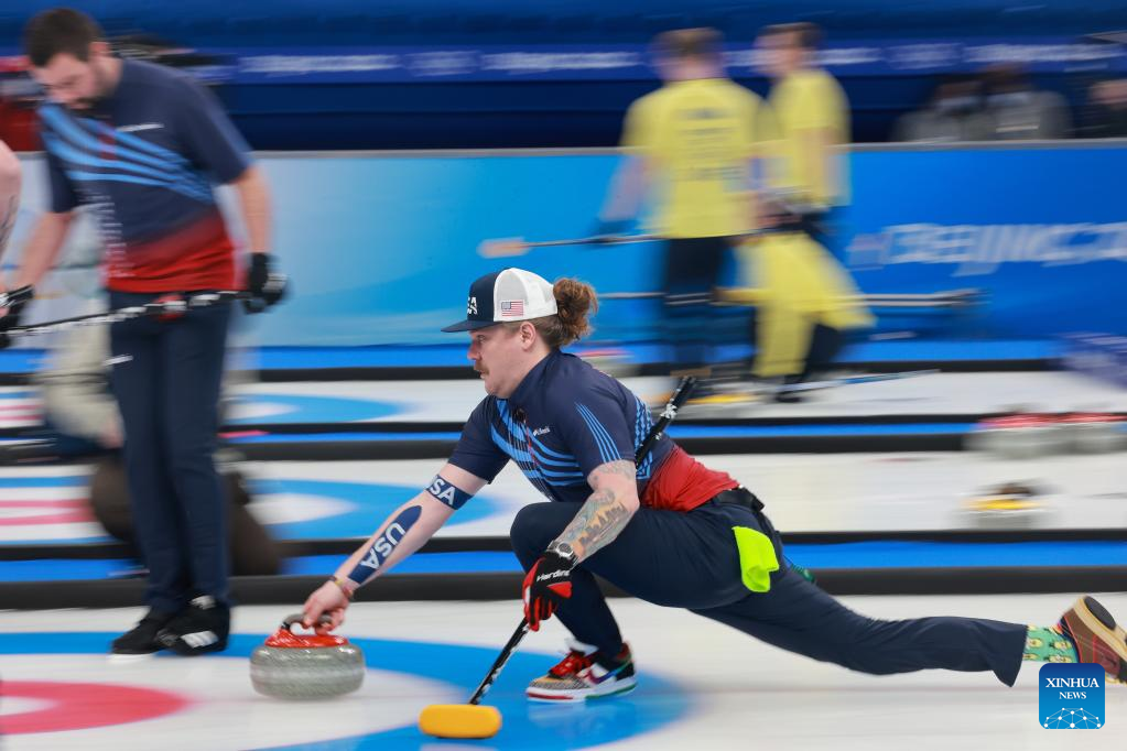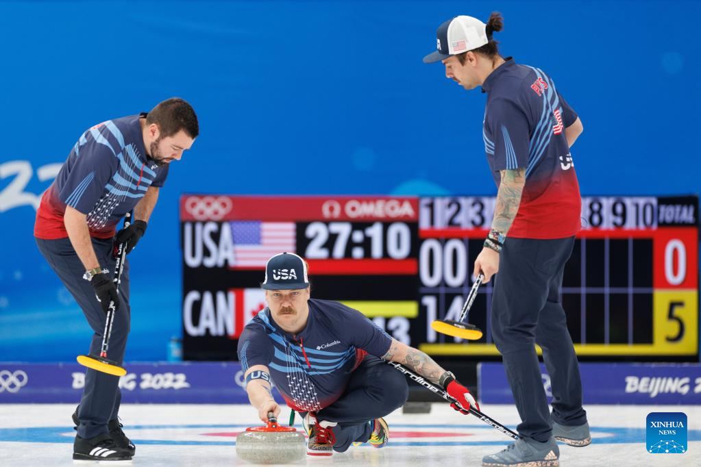 Matt Hamilton (C) of the United States competes during the Curling Men's Round Robin Session 6 of the Beijing 2022 Winter Olympics between Canada and the United States at the National Aquatics Centre in Beijing, capital of China, Feb. 13, 2022. (Xinhua/Liu Xu)