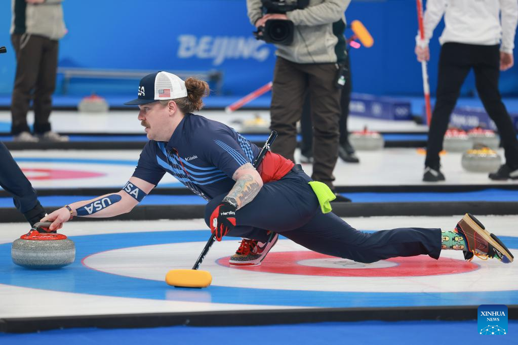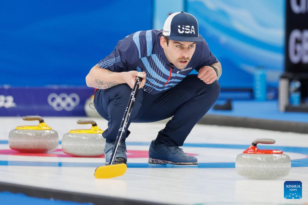 Matt Hamilton of the United States competes during the Curling Men's Round Robin Session 6 of the Beijing 2022 Winter Olympics between Canada and the United States at the National Aquatics Centre in Beijing, capital of China, Feb. 13, 2022. (Xinhua/Liu Xu)