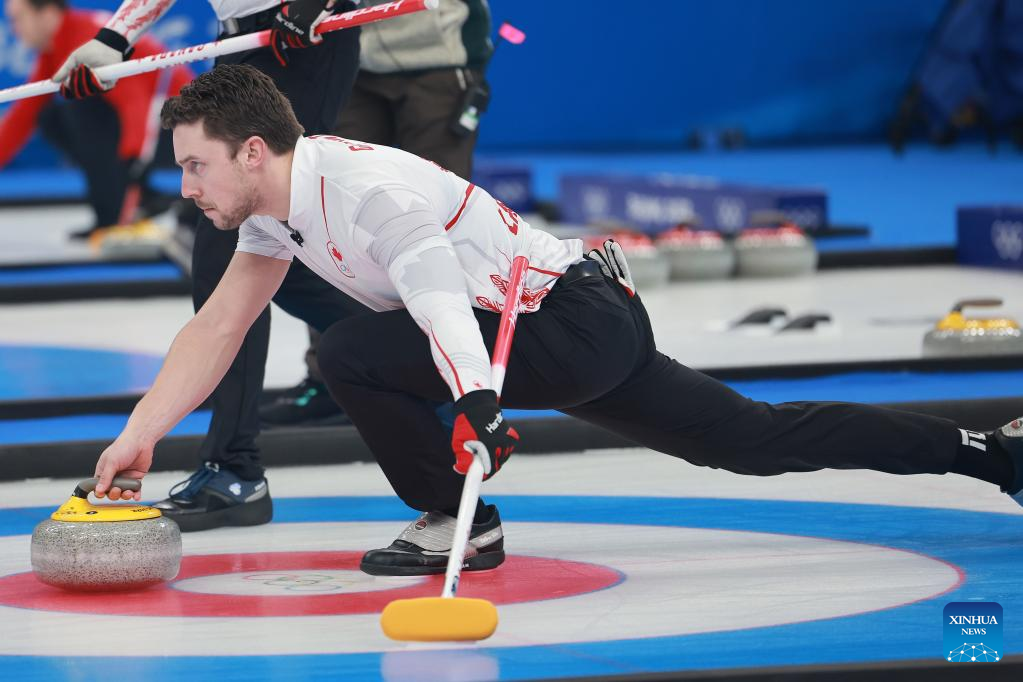 Brett Gallant of Canada competes during the Curling Men's Round Robin Session 6 of the Beijing 2022 Winter Olympics between Canada and the United States at the National Aquatics Centre in Beijing, capital of China, Feb. 13, 2022. (Xinhua/Liu Xu)