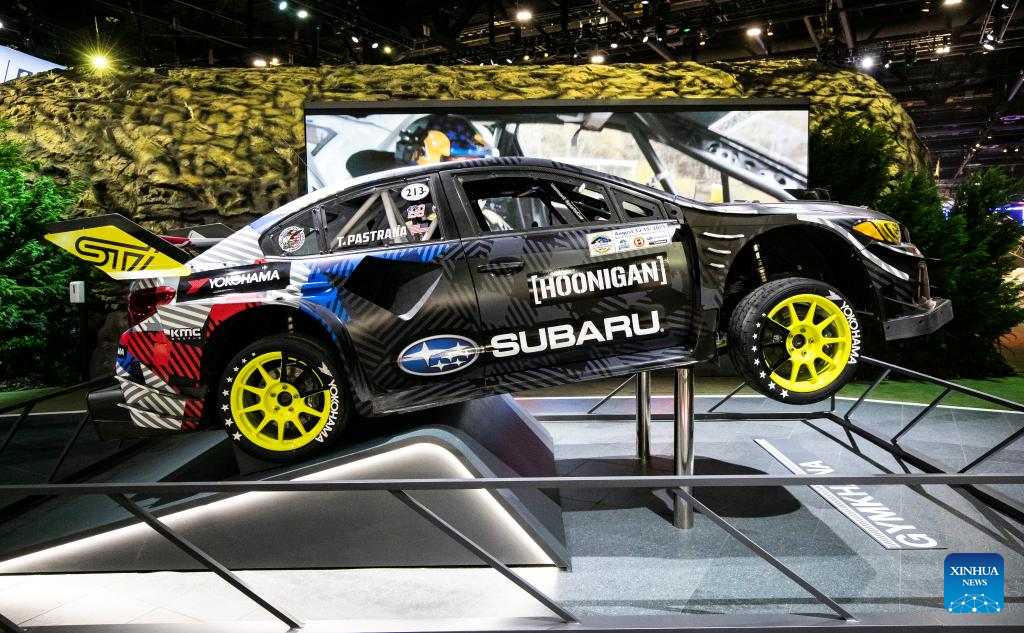 The Subaru WRX Sti rally car is displayed during the Chicago Auto Show at McCormick Place in Chicago, the United States, on Feb. 15, 2022. The show is held from February 12 to 21. (Photo by Joel Lerner/Xinhua)