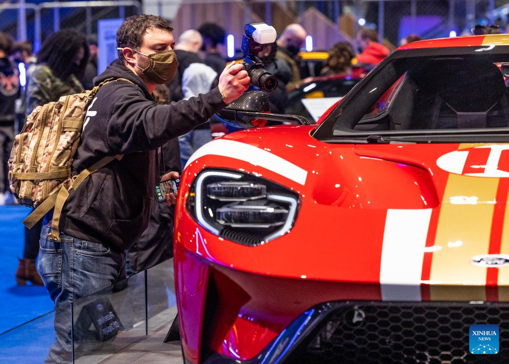 A visitor gets up close to a 2022 Ford GT during the Chicago Auto Show at McCormick Place in Chicago, the United States, on Feb. 15, 2022. The show is held from February 12 to 21. (Photo by Joel Lerner/Xinhua)