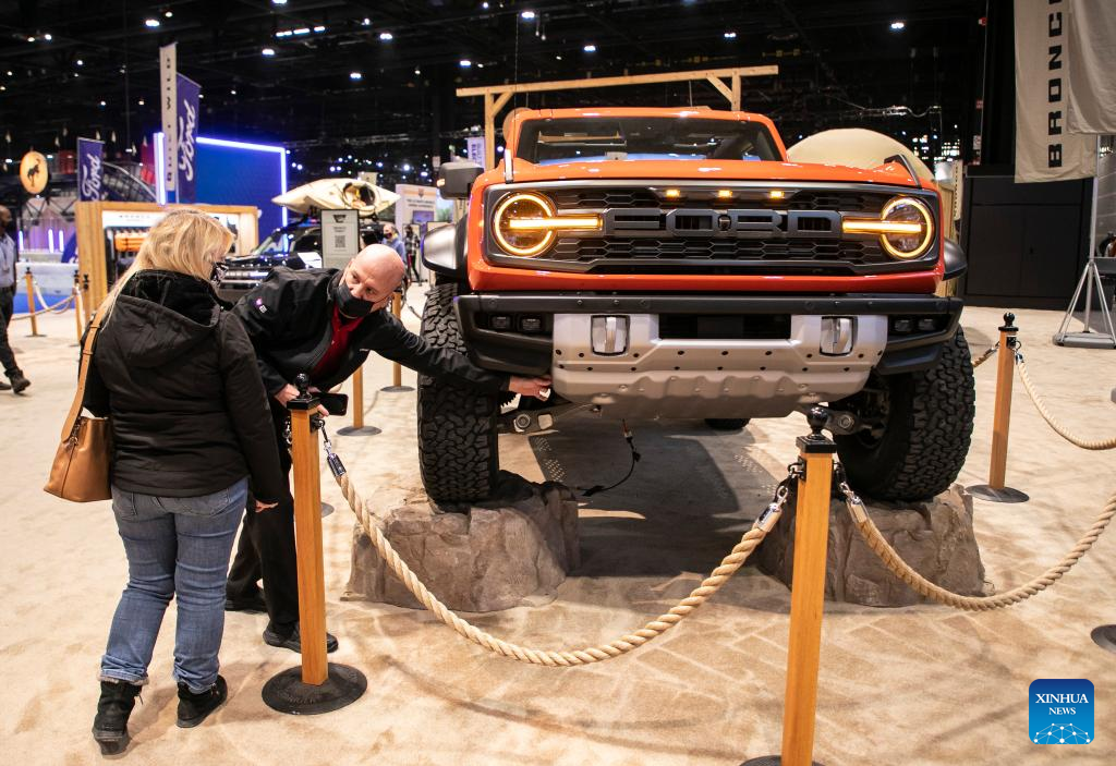 Two visitors look at the suspension of a 2022 Ford Bronco at the Chicago Auto Show at McCormick Place in Chicago, the United States, on Feb. 15, 2022. The show is held from February 12 to 21. (Photo by Joel Lerner/Xinhua)