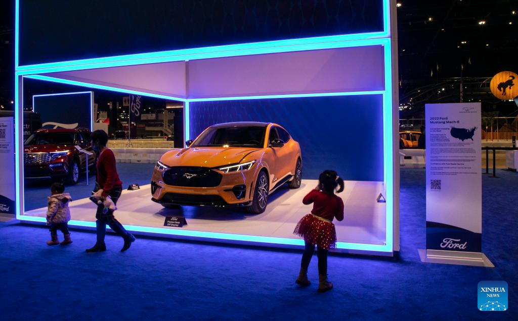 The 2022 Ford Mustang Mach-E GT is displayed during the Chicago Auto Show at McCormick Place in Chicago, the United States, on Feb. 15, 2022. The show is held from February 12 to 21. (Photo by Joel Lerner/Xinhua)