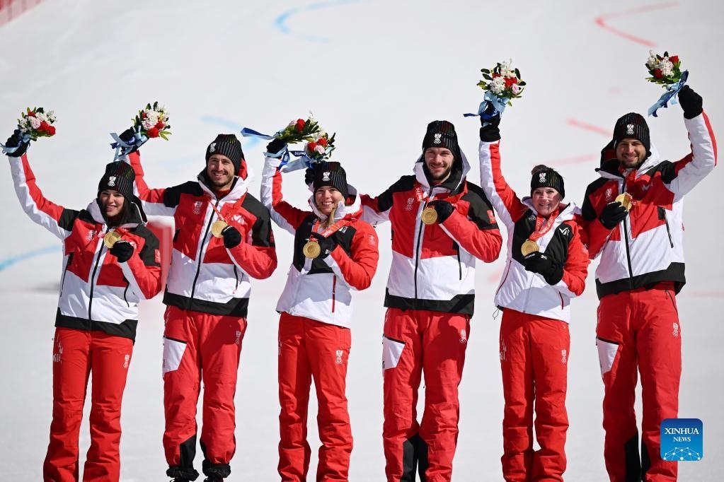 Team Austria attend the awarding ceremony after the alpine skiing mixed team parallel final of Beijing 2022 Winter Olympics at National Alpine Skiing Centre in Yanqing District, Beijing, capital of China, Feb. 20, 2022. (Xinhua/Chen Bin)