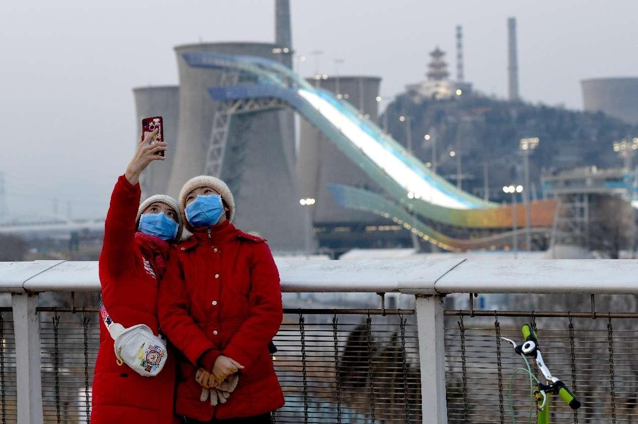 Citizens take selfies near Big Air Shougang, a venue for Beijing 2022 Winter Olympic Games. (Photo by Li Wenming/People’s Daily Online)