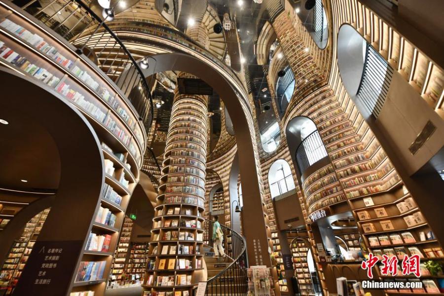 Photo shows the interior of Zhongshuge bookstore in Dujiangyan, southwest China's Sichuan Province, March 15, 2022. Dujiangyan Zhongshuge relies on strategically placed mirrors and gleaming black tile floor to create a stunning illusion that makes the place look like an endless bookworm’s paradise. The entity won the professional judges award on the 2021 A+ Awards and has been attracting visitors with its unique design. (Photo: China News Service/Zhang Lang)