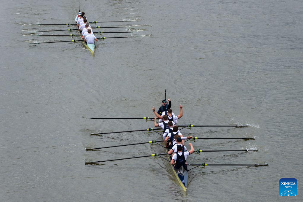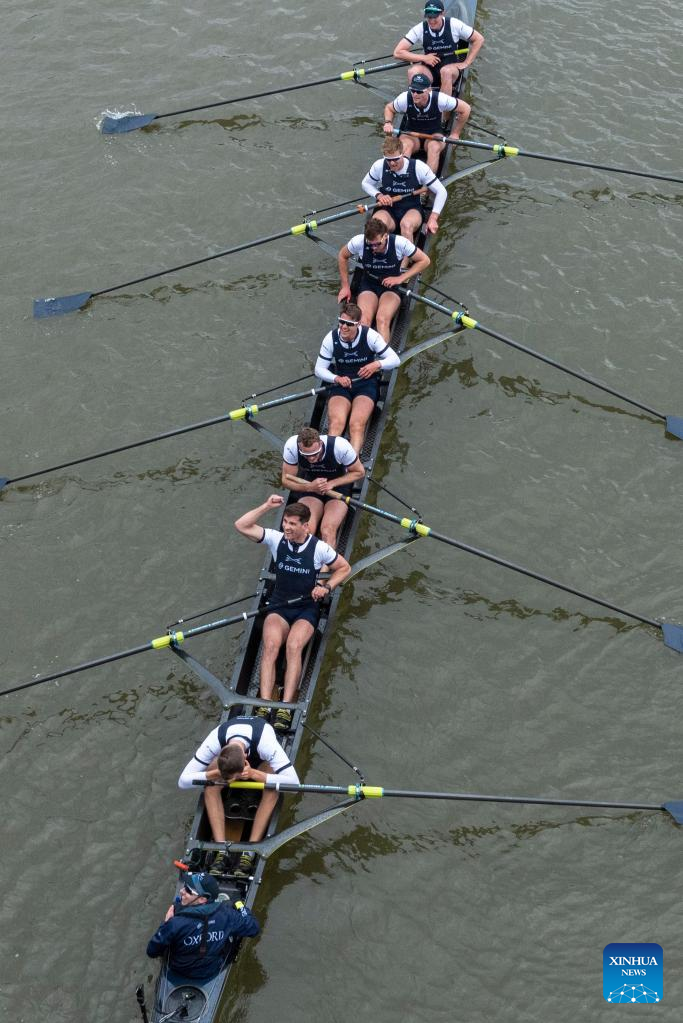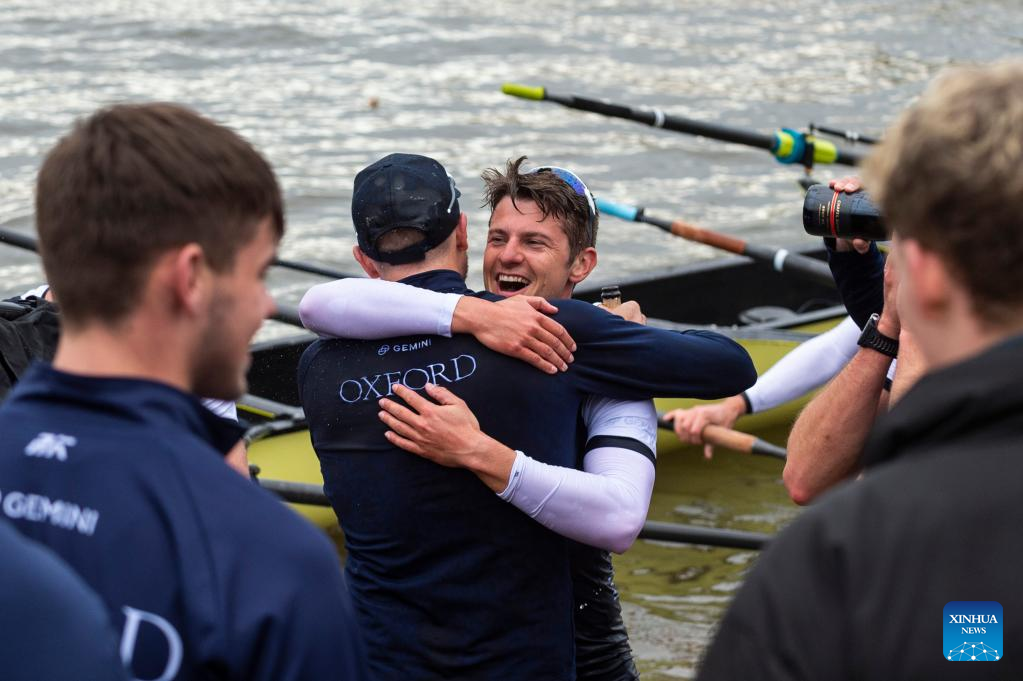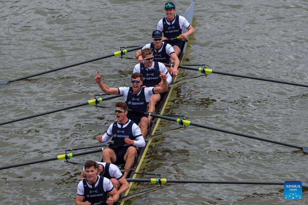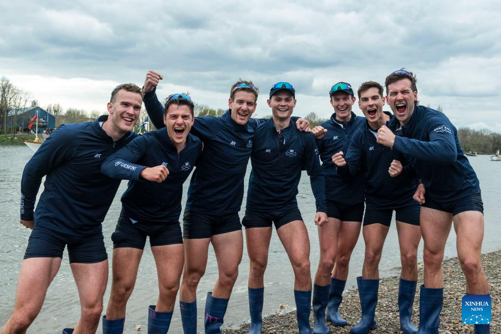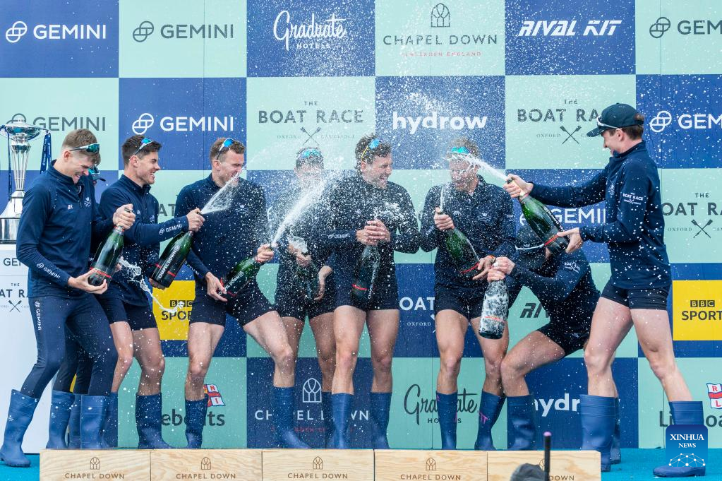 Oxford University (front) men's crew celebrate winning the men's boat race between Oxford University and Cambridge University on the River Thames in London, Britain, April 3, 2022. (Photo by Stephen Chung/Xinhua)