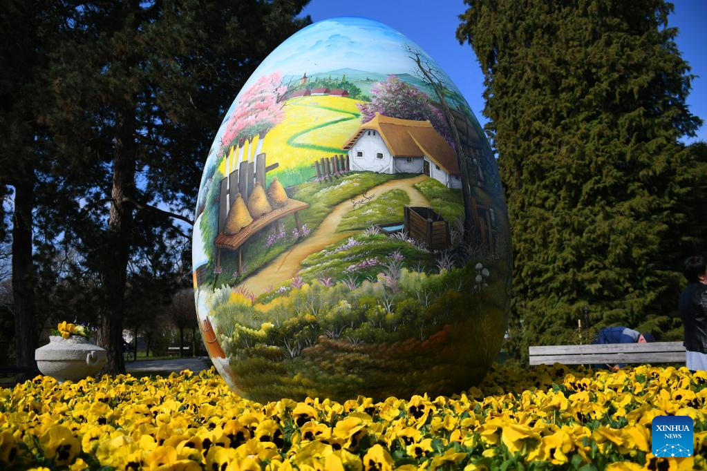 An Easter egg painted with traditional motifs is on display as the traditional pre-Easter exhibition of huge Easter eggs is opened in Koprivnica, Croatia, on April 4, 2022. (Damir Spehar/PIXSELL via Xinhua)