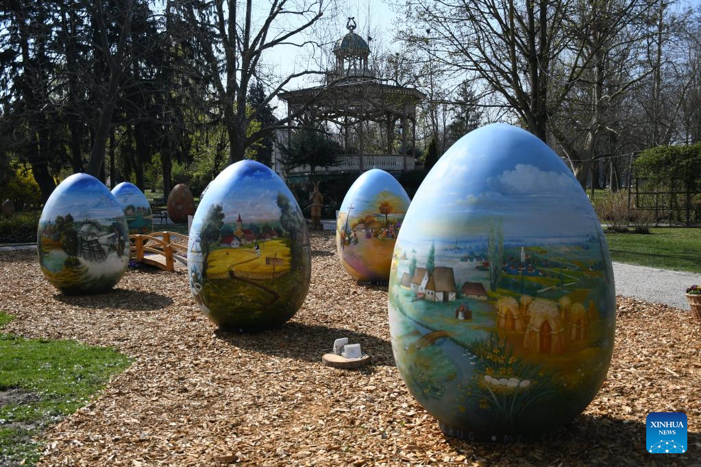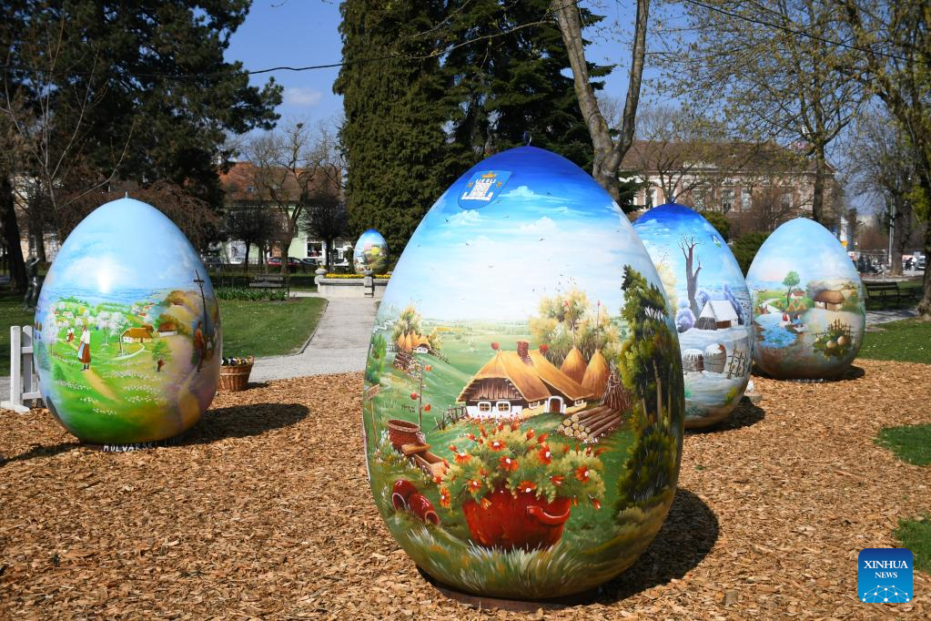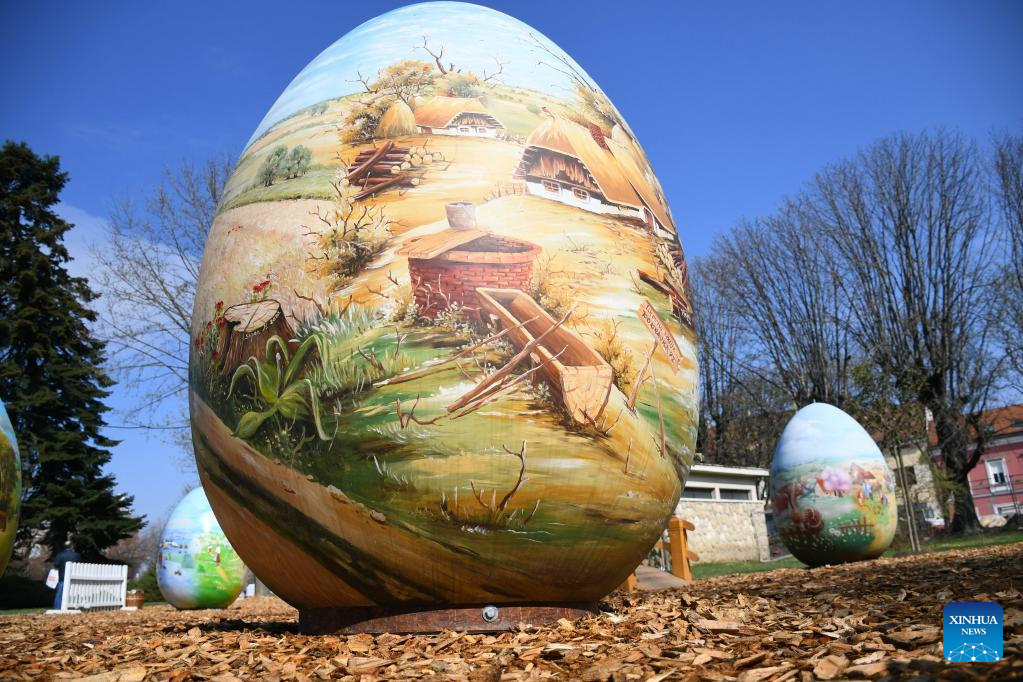 Easter eggs painted with traditional motifs are on display as the traditional pre-Easter exhibition of huge Easter eggs is opened in Koprivnica, Croatia, on April 4, 2022. (Damir Spehar/PIXSELL via Xinhua)
